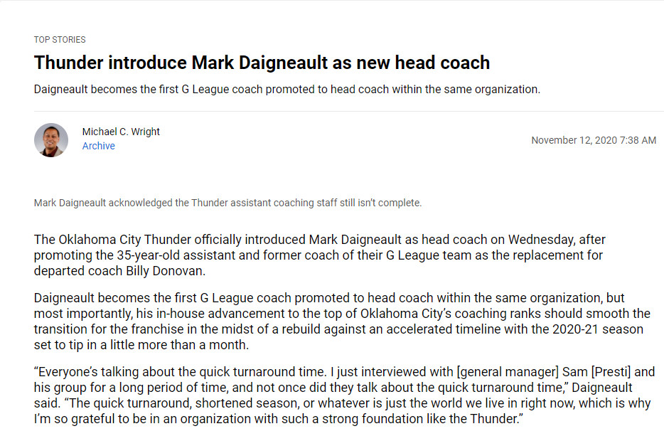โปรโมทโค้ช จากทีม G-league ในเครือ OKC. Mark Daigneault อายุ 35 อายุน้อยกว่าผู้เล่นบางคนใน NBA ซะอีก