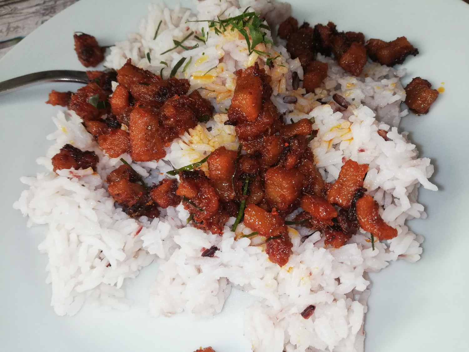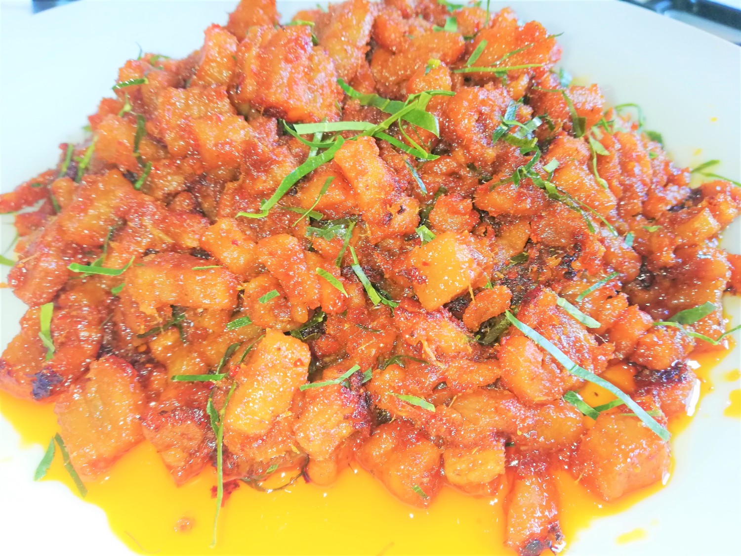 มาทานกันค่ะราดข้าวสวยร้อนๆกรอบๆ หวานนิด เค็มหน่อย หอมพริกแกง หูยอร่อยค่ะเพื่อนๆ