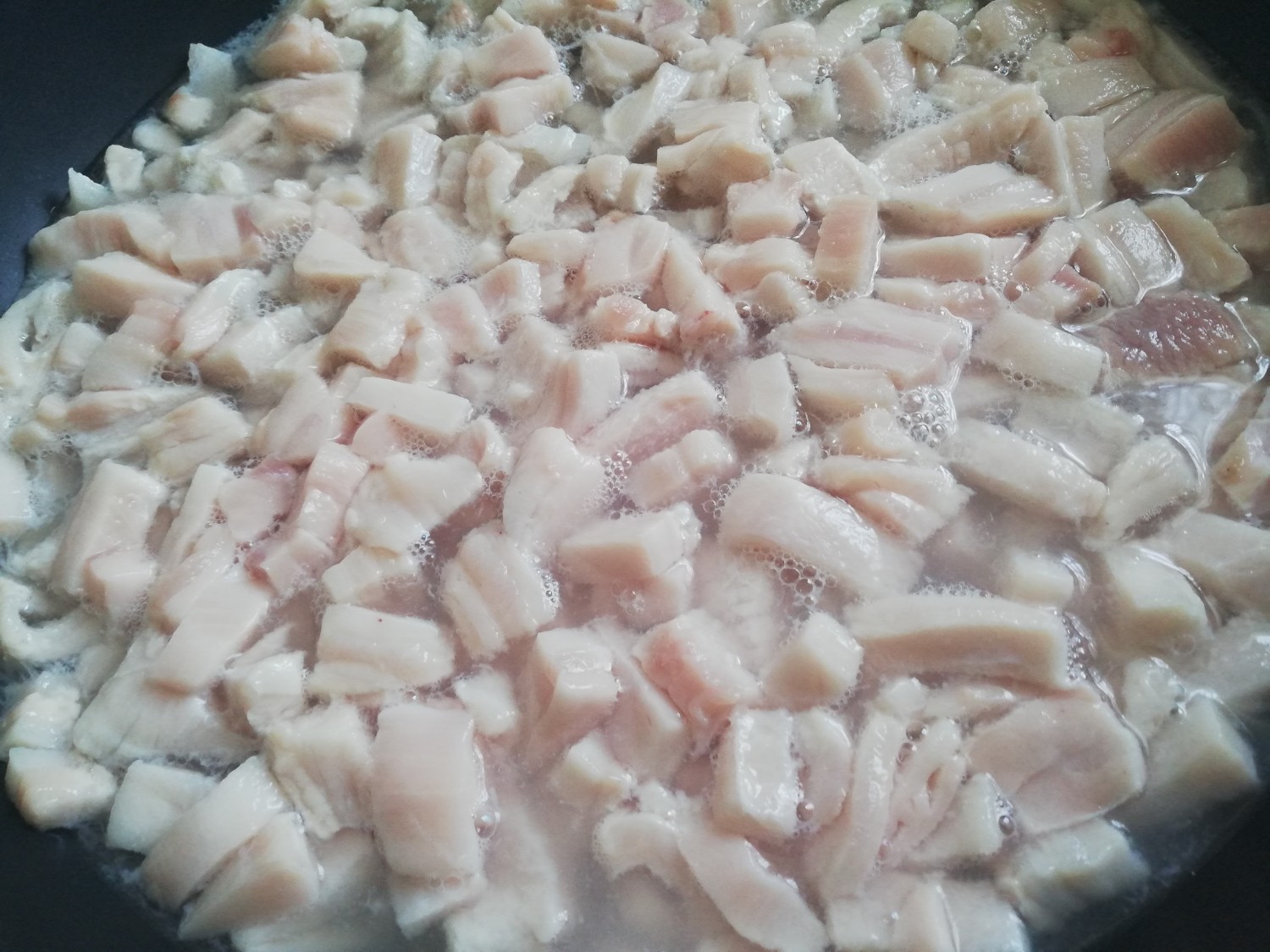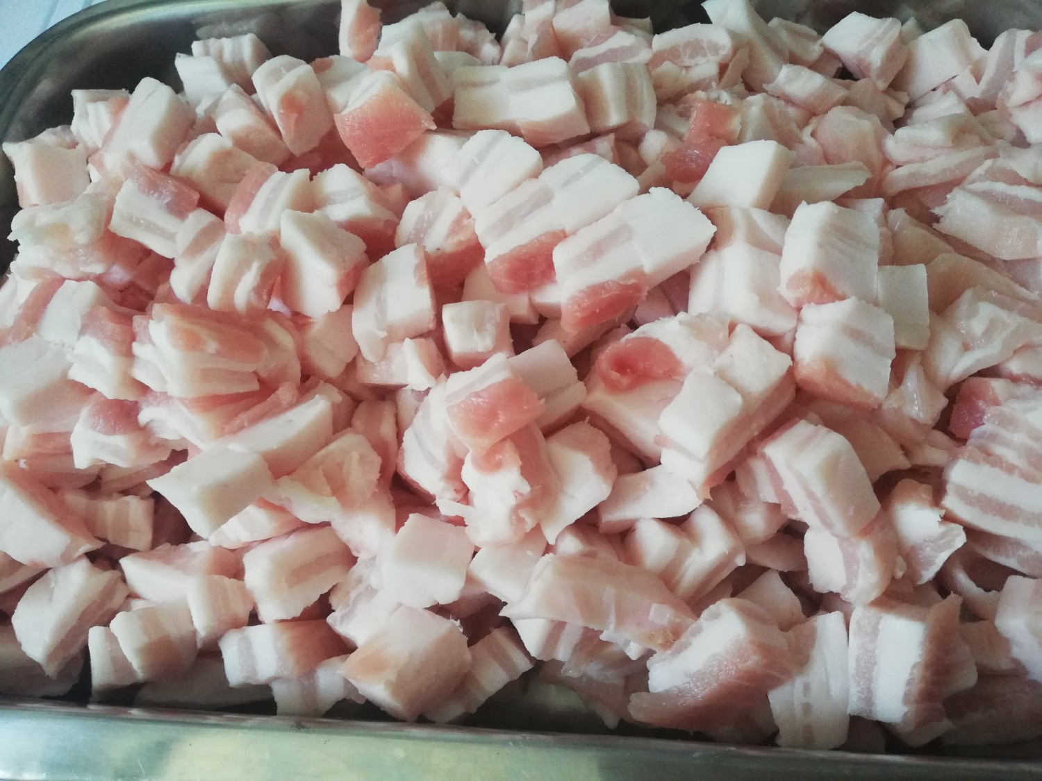 เริ่มจากล้างทำความสะอาดและหั่นมันหมูเป็นชิ้นเล็กชิ้นประมาณครึ่งเซนติเมตรหรือตามรูปด้านล่างได้เลยนะค่ะ