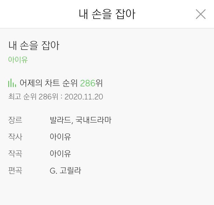 เพลง Hold my hand เป็นเพลงแรกที่ไอยูแต่งด้วยตัวเอง ถูกปล่อยมาตั้งแต่ปี 2011 ตอนนี้กลับมาอยู่ที่ 286 ในชาร์ตเมล่อนปกติ (พุ่งขึ้นมาจากอันดับ 391 เมื่อ 2 วันก่อน)