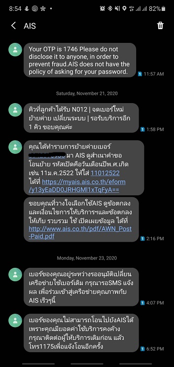 เมื่อวันที่ 21/11/2563 ผมไปทำเรื่องขอย้ายค่าย ที่ศูนย์ true central wesgate บางใหญ๋ โดยไปชำระยอดต่างๆ และ พนง.ก็ให้เลข pin ย้ายค่าย ผมก็ไปติดต่อ AIS จนได้ซิมมาเรียบร้อยแล้ว โดยพนักงานแจ้งว่าใช้เวลาประมาน วันจันทร์ หรืออังคาร จะย้ายค่ายสำเร็จ
