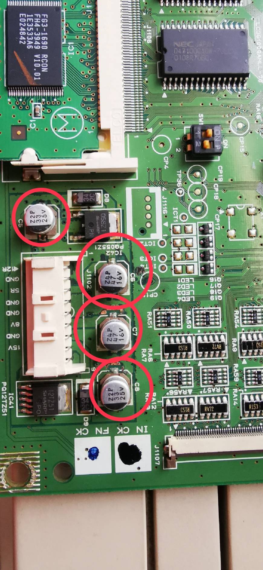 แผงวงจรในรูปที่วงกลมแดงไว้เข้าใจว่าน่าจะเป็นตัว SMD electrolytic capacitor แต่อยากรู้ค่าที่เขียนไว้ครับ