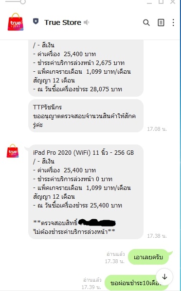 ได้ทำการสั่งซื้อ ipad pro ผ่านทาง line @truestore หลังจากตกลงเลือกเครื่องพร้อมสั่งซื้อ พนง กลับหายไปสะงั้นพยายามติดต่อหาถึง4วันก็ไม่มีการตอบกลับจึงอยากรู้ว่านี้คือการให้บริการของ true หรอไม่ขายให้กะบอกไม่ ขายสิไม่ให้หายไปสะดื้อเสียอารมโคตร เหตุเกิดวันที่ 23-11-60 จนถึงวันนี้ ยังไม่มีคำตอบกลับจาก พนง