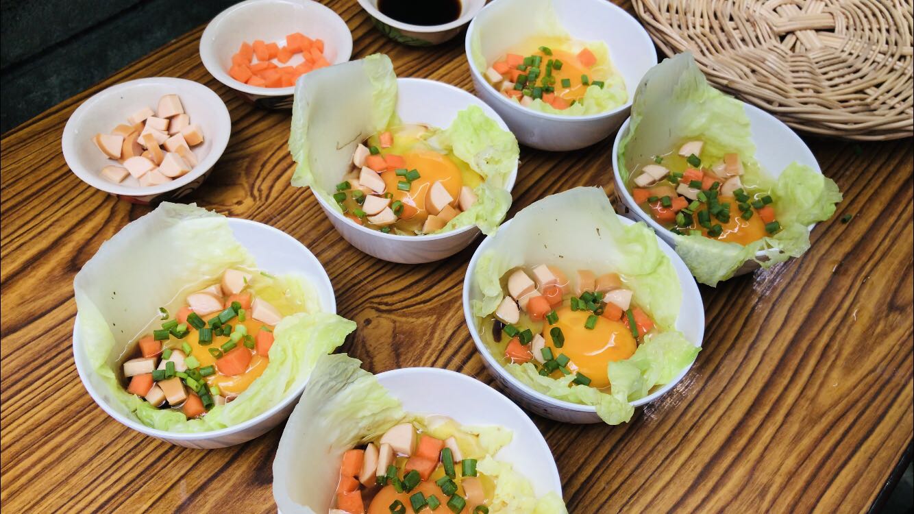 3.ตอกไข่ใส่ผักกาดขาวที่ละถ้วย ตามด้วย ใส่แครอท นิดหน่อย ไส้กรอก ปรุงรสด้วย ซีอิ๊วขาว โรยหน้าด้วยหอมซอย และค่อยๆห่อผักกาดขาว ให้ปิดหน้าไส้เรา ขั้นตอนี้เบาๆ เดียวไข่แดงแตก
