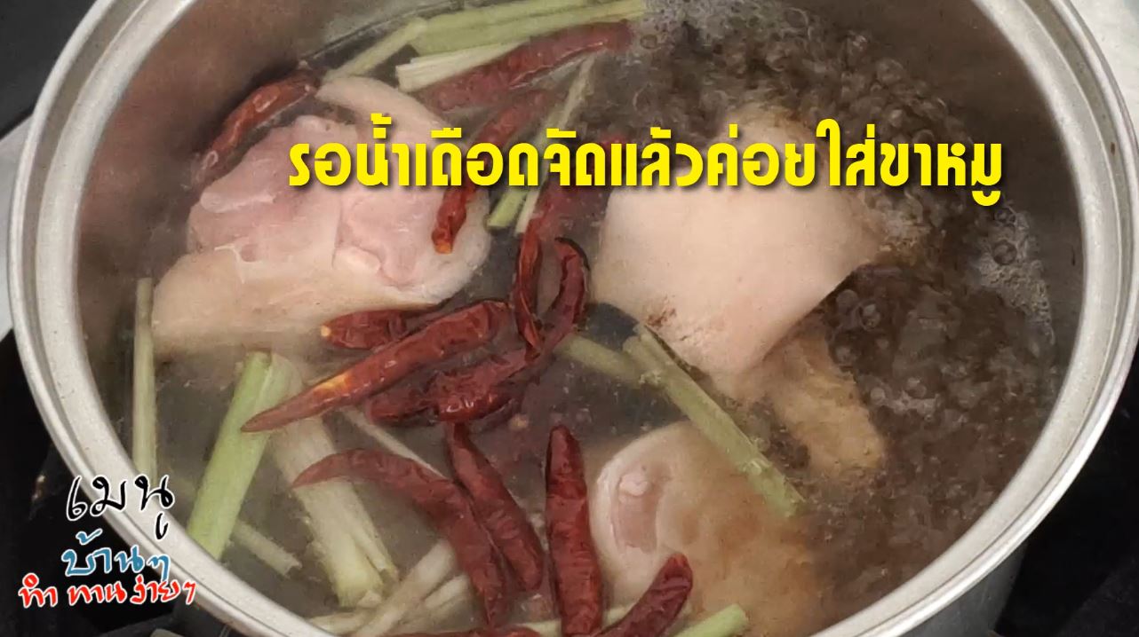 2.รอน้ำเดือดจัด ใส่ขาหมู ต้มจนขาหมูใกล้เปื่อย ใส่หอมแดง และเห็ดต้มต่อจนทุกอย่างสุกดี ชิมรส ให้โดนใจ ตักเสริฟ์ซดร้อน ๆ อร่อย สุด ๆ
