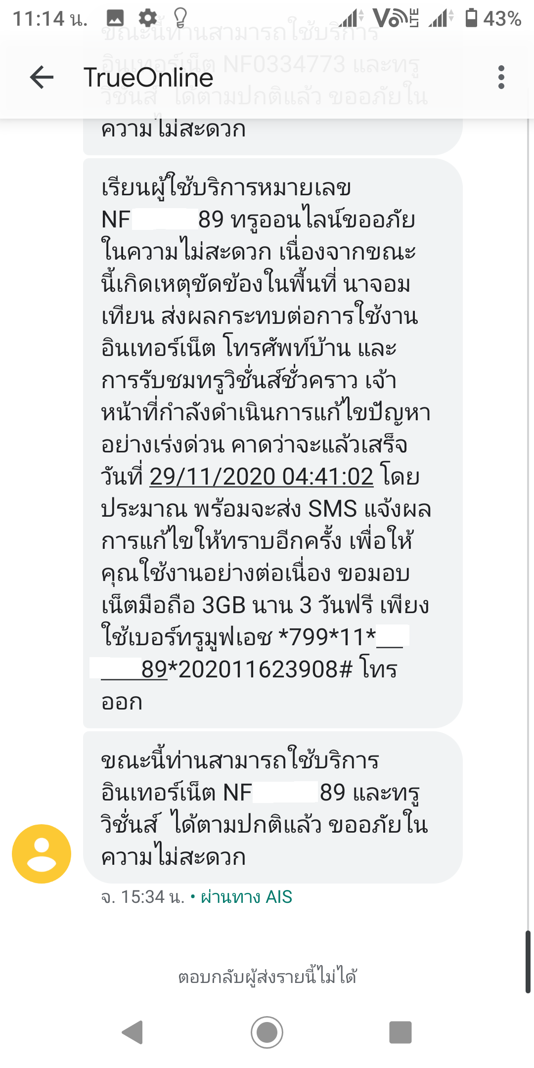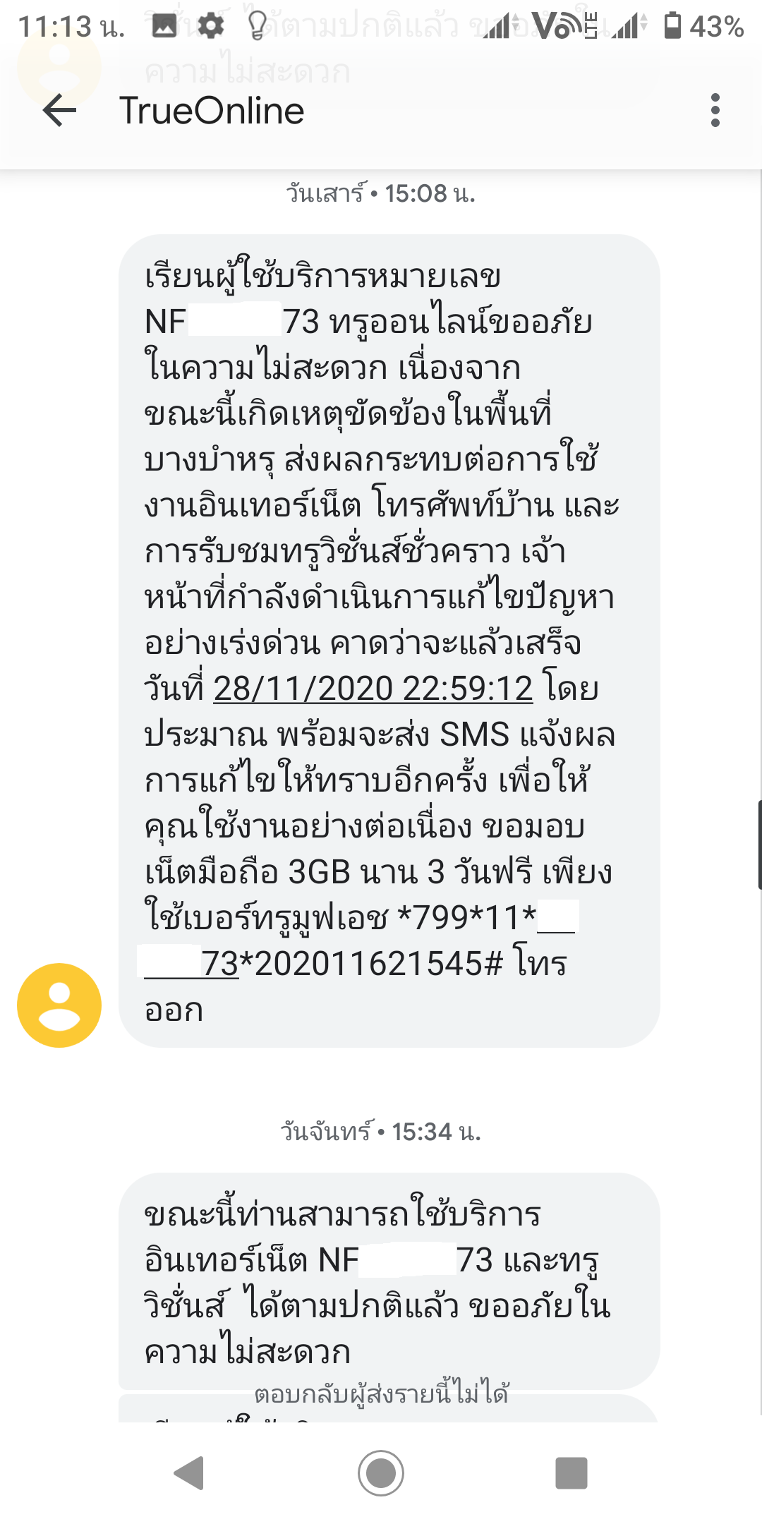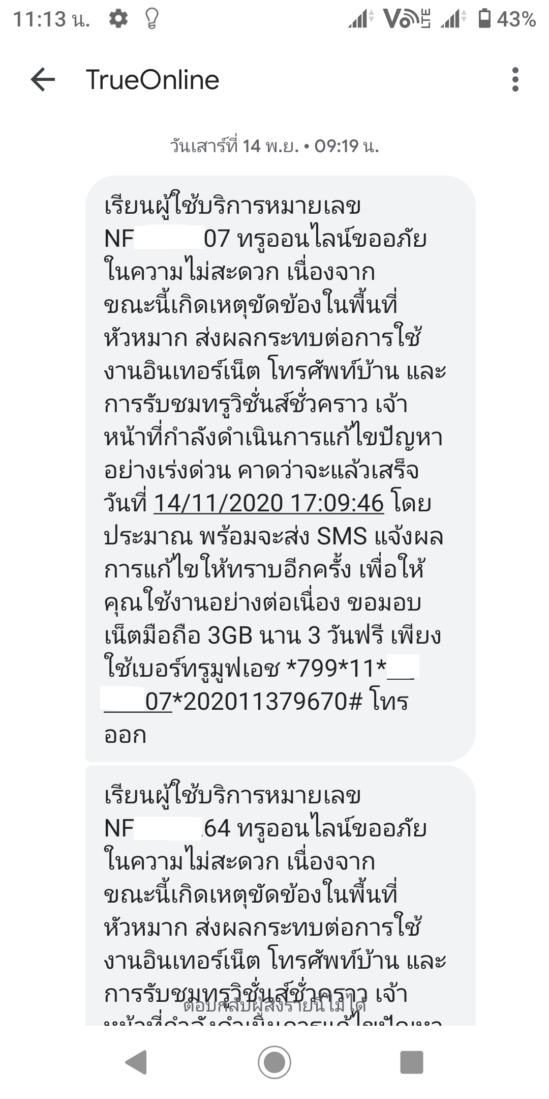 เมื่อ พ.ย. 62 ผมย้ายที่ติดตั้งเน็ตทรูใหม่ หลังจากนั้น ทรูมีการเปลี่ยนอุปกรณ์โมเด็มให้ลูกค้าใหม่ ผมได้รับสายจากช่างทรู ทั่วประเทศ 20 กว่าสาย ว่าจะเข้ามาเปลี่ยนอุปกรณ์ใหม่ให้ผม แรกๆ ก็ไม่อะไร หลังๆ มาเริ่มเยอะขึ้น เลยลองถามจังหวัด และชื่อผู้ใช้บริการดู ปรากฏว่าเป็นใครก็ไม่รู้ หลากหลายทั่วทุกภาค หลังจากนั้นก็ได้รับโทรศัพท์แจ้งค่าใช้บริการจากทรู ซึ่งโทรมาทวงจากหลากหลายพื้นที่ เช่นวันนี้ คุณประมวล (นามสมมุติ) ใช้งานในจังหวัดขอนแก่น ค้างค่าเน็ตทรูอยู่นะครับ ไปจ่ายด้วยเด้อ และพิเศษสุดๆ คือ ได้รับ SMS จากทรูออนไลน์ว่า อินเตอร์เน็ตหมายเลข NFXXXXXXX และทรูวิชั่น เกิดเหตุขั้ดข้อง ในพื้นที่ หัวหมาก บางบุหรุ นาจอมเทียน และที่อื่นๆ อีกหลากหลายพื้นที่ ตามภาพ