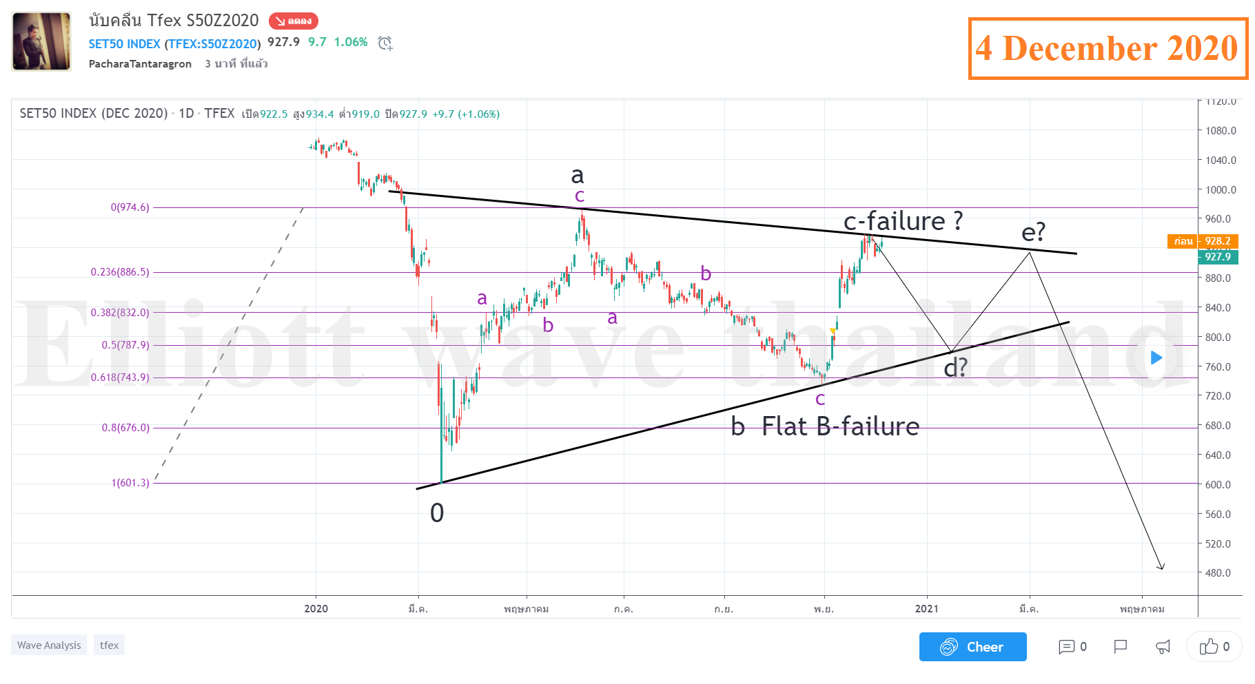Tfex S50Z2020 Correction มองได้สองแบบว่าเป็น Flat หรือ Triangle Wave-b รูปแบบ Weak-b Flat บทที่ 5 เขียนไว้ว่า "Weak b-waves are characterized by their less than normal retracement of wave-a. To classify as a weak b wave, it must retrace between 61.8%-80% (inclusive) of wave-a. If the c-wave is less than 100% of wave-b , the pattern should be called a Double Failure. If wave-c is between