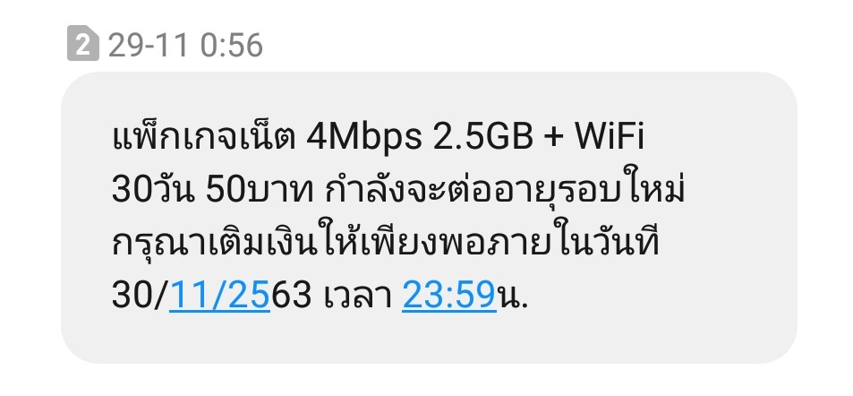 ภาพต่อไปนี้คือภาพข้อความ sms ที่ระบบส่งมาให้ต่อโปรเดิมภายใน 30 พ.ย.
