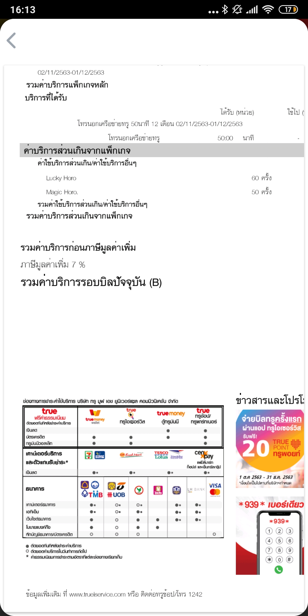 โปรโมชั่นทรูรายเดือนที่ใช้อยู่ เป็นโปร 699 ลด 50% เหลือเดือนละ 374 บาท เล่นเน็ต 50 GB โทรฟรีทุกเครือข่าย 300 นาที แล้วอยู่ๆก็คิดราคาเต็มโดยไม่แจ้งล่วงหน้าซึ่งเคยถามกับเจ้าหน้าที่ตอนเสนอโปรแล้ว แจ้งว่า