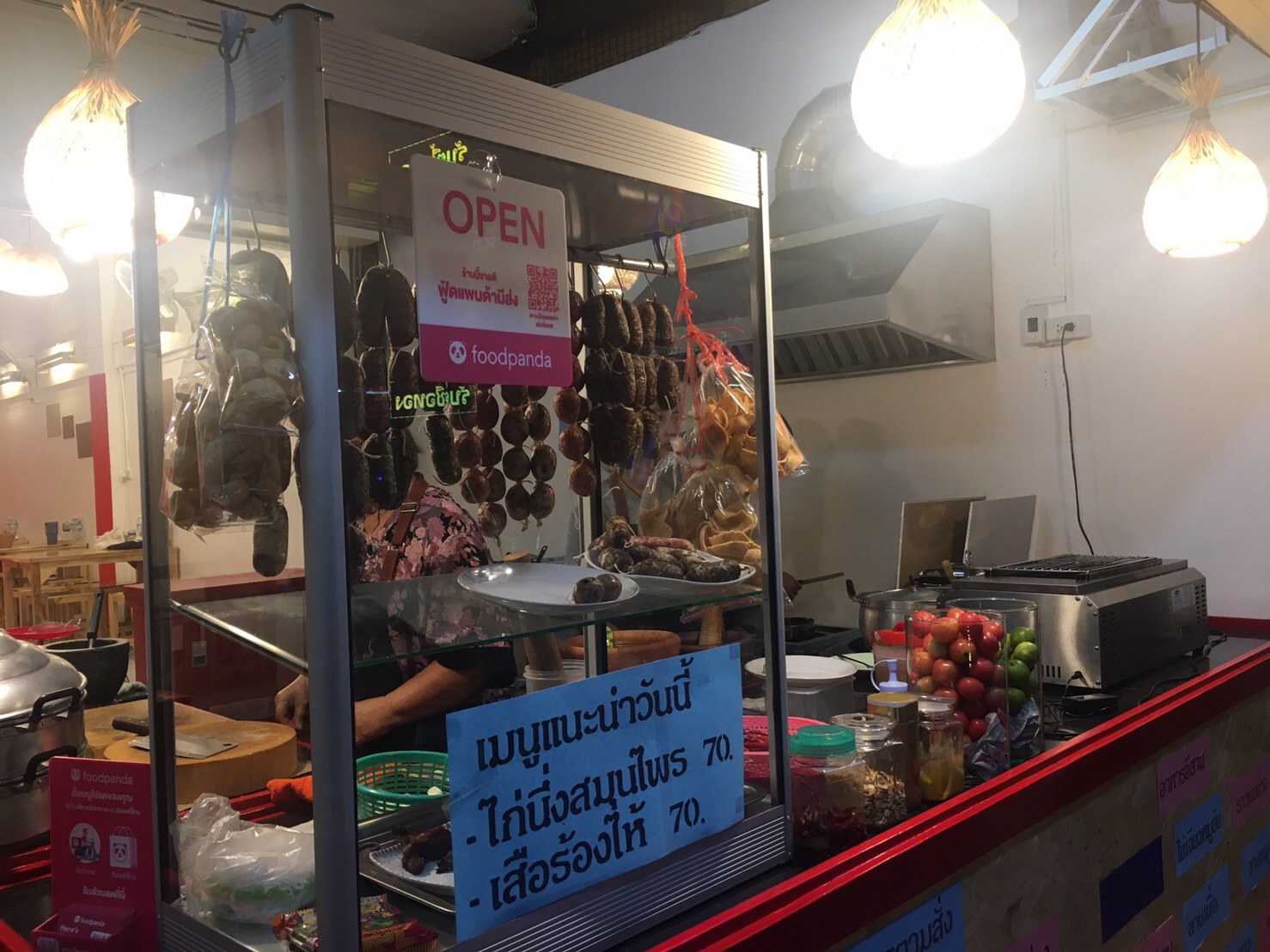 ไส้กรอกอีกสาน มาพ่วงเต็มตู้ยังกับ ข้าวต้มกุ้ย เป็นแบบนั้นจิงๆ บรรยากาศไม่อึดอัดสบาย เข้าไปนั่งปั้บ เด็กเสริฟก็มารับเมนูทันที เราก็เห็นบ่อยแล้วเนอะ ไอ้ อาหารอีสานเนี่ย