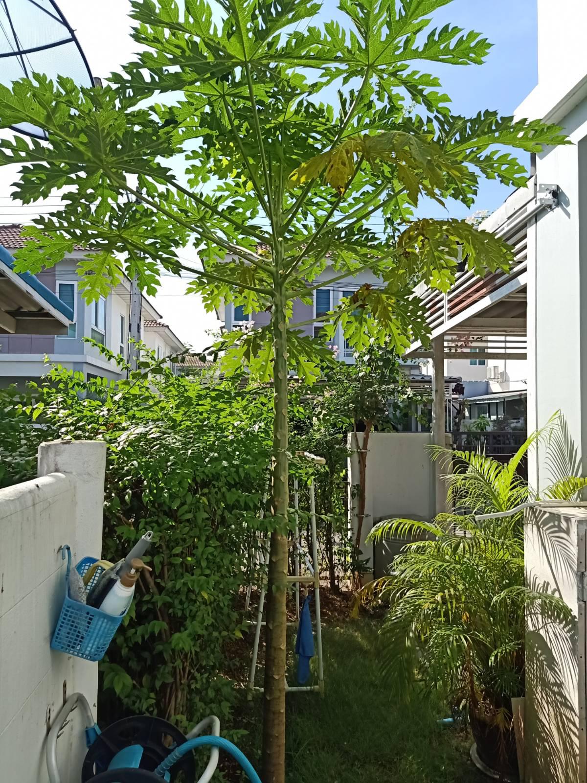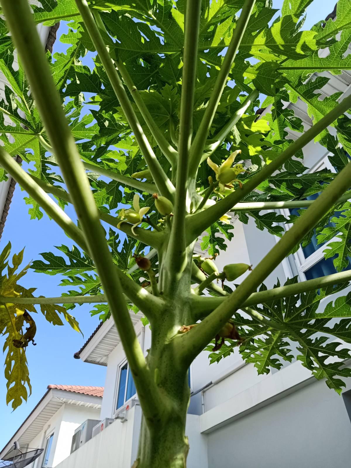 เนื่องจากปลูกในสวนเล็กๆหน้าบ้านครับ ต้นไม้ปลูกค่อนข้างติดกัน ห่างกัน 1 เมตร ต้นมะละกอปลูกจนออกดอก ติดลูก นับได้ 10 ลูก สังเกตว่าดอกที่ 11-12-13 ที่ออกมาด้านบน จะหลุดร่วง ไม่ค่อยติดเป็นผล ปกติจะใส่ปุ