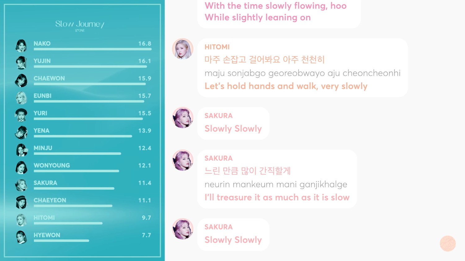 Slow Journey ของizone ที่แชวอนแต่งเนื้อร้อง ทำนอง รู้สึกว่าฟังเพลงเต็มๆของนาโกะ เวลาร้องเพลงช้าๆแนวeasy listening