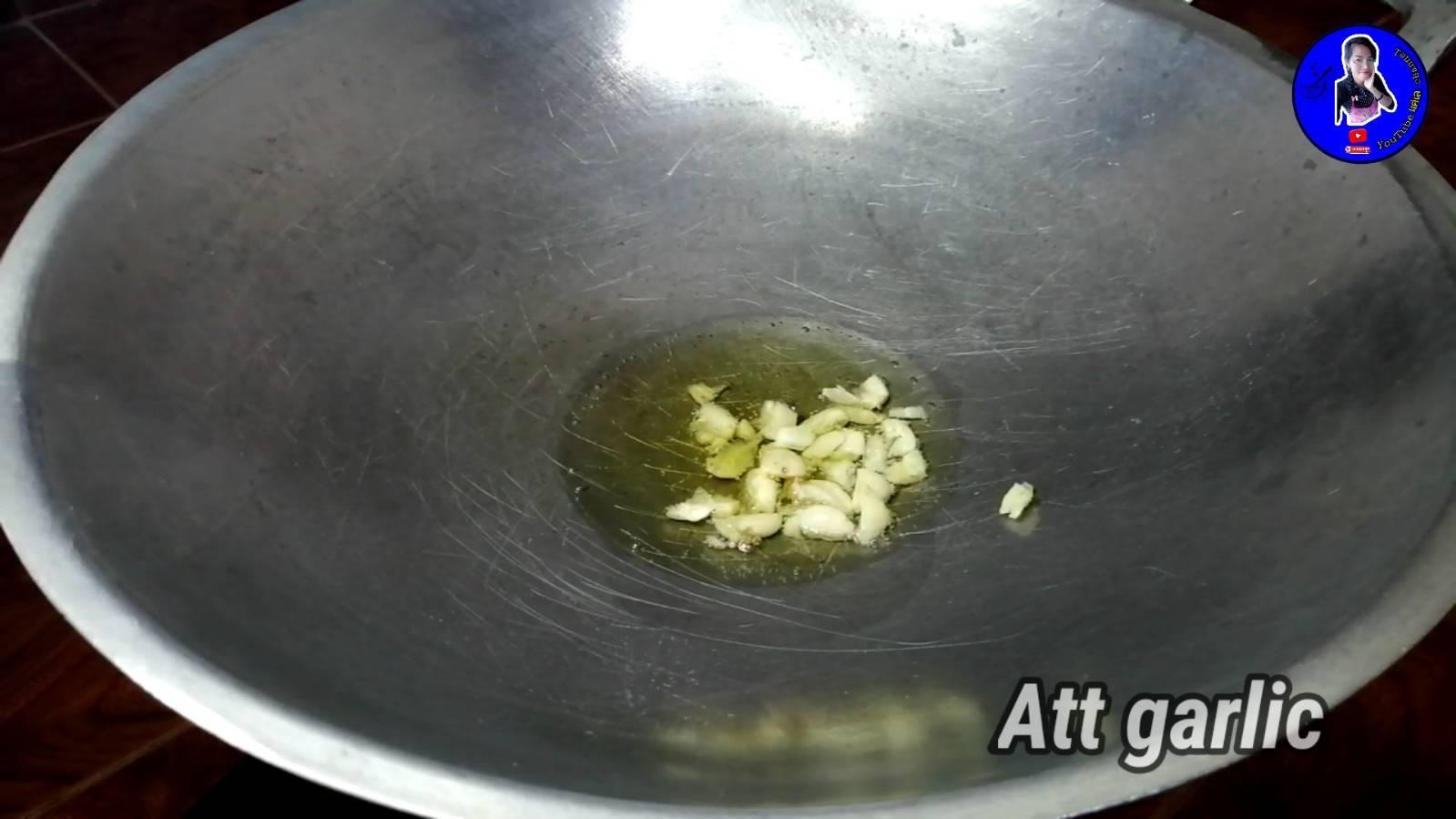 .ตั้งกระทะใส่น้ำมัน เมื่อน้ำมันร้อน ให้ใส่กระเทียมลงไปค่ะ ผัดให้หอมเลยนะคะ