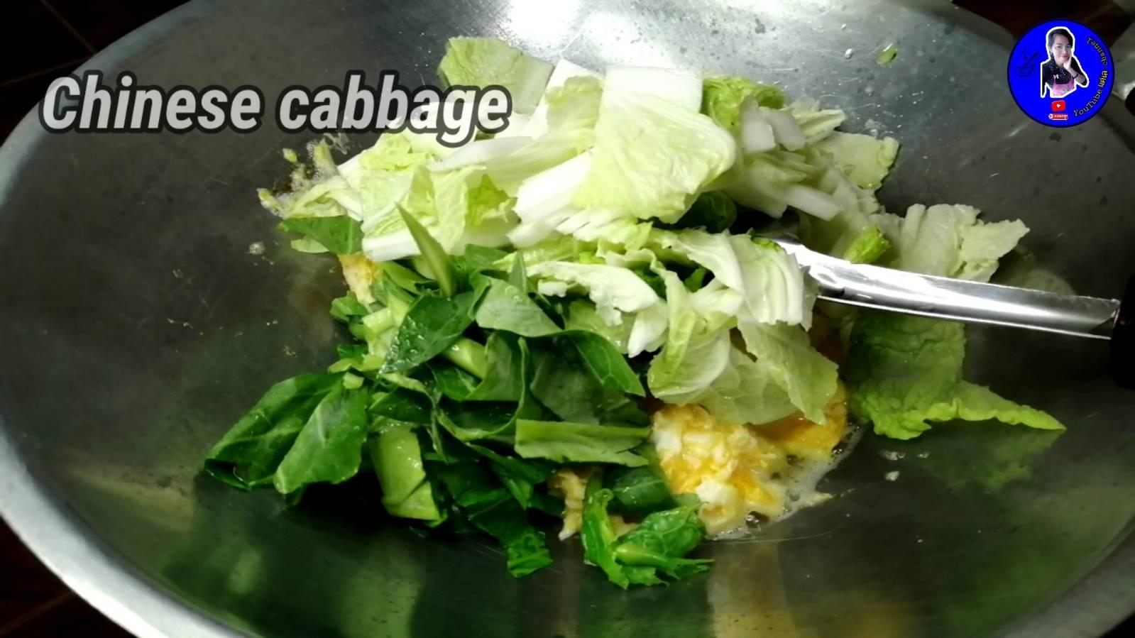 .เมื่อไข่สุกแล้ว ใส่ผักที่เตรียมไว้ลงไป ผักคะน้า ผักกาดขาว แครอท พริกหวาน มะเขือเทศ