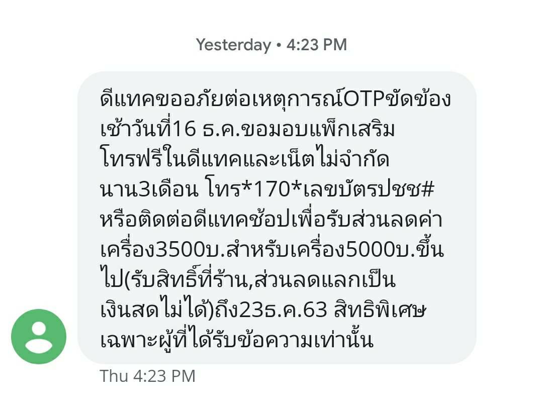 DATC เสนอมาตรการเยียวยา ชดใช้ที่มีปัญหาระบบ OTP ล่ม ตอนลงทะเบียนคนละครึ่ง phase2 ให้ส่วนลดค่าเครื่อง 50% วันนี้ติดต่อเรื่องเปลียนโปรโมชั่นโทร เพิ่งรู้ว่า DTAC พ่วงติดสัญญา 6 เดือนมาด้วย โดย ที่ทั้ง SM