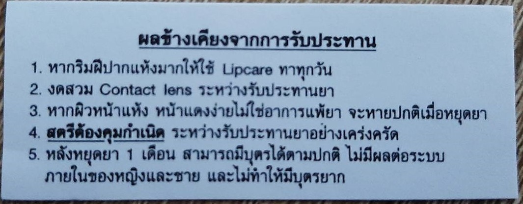 แต่แฟนผมตีความว่า "สตรีต้องทำการคุมกำเนิดอย่างเคร่งครัด" ถ้าหากรับประทานยา(ลดสิว)ตัวนี้อยู่