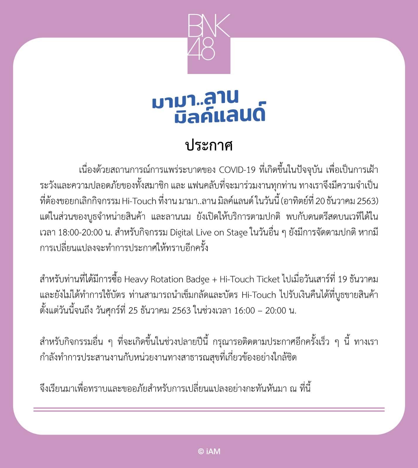 เนื่องด้วยสถานการณ์การแพร่ระบาดอย่างรุนแรงของ COVID-19 ในช่วงนี้ เพื่อความปลอดภัย ทางเราจึงขออนุญาตยกเลิกการเดินทางมาไลฟ์ยัง BNK48 Digital Studio ในวันที่ 7 เมษายน 2564 ของสมาชิก BNK48 และ CGM48 ตามที