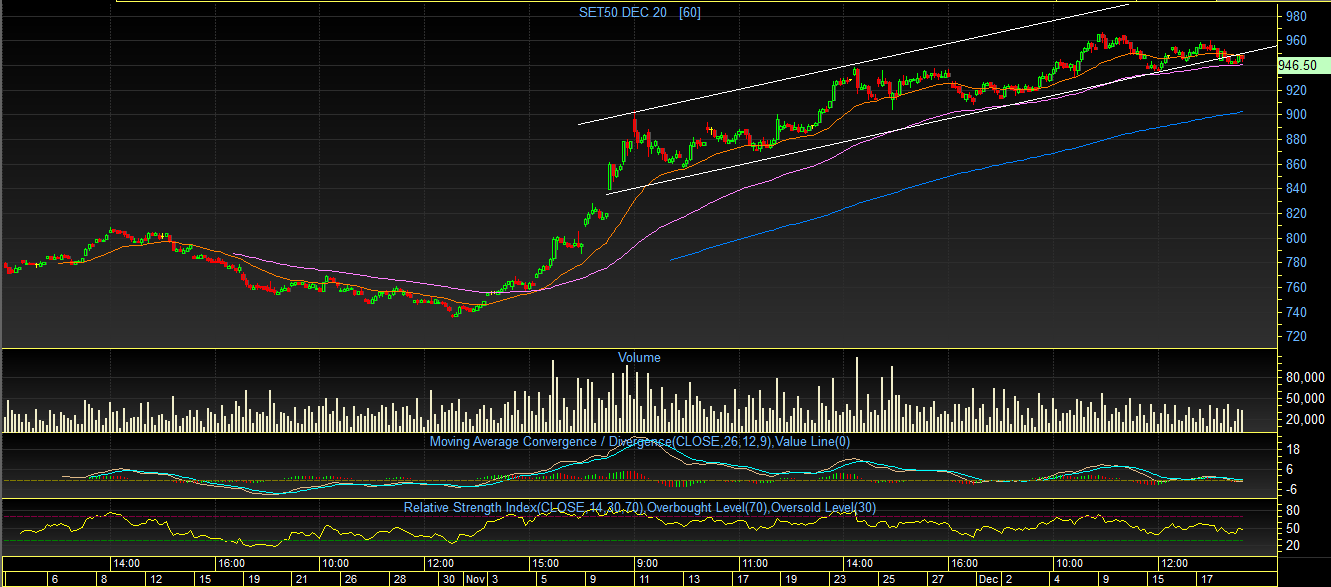S50Z20 TF Day: ตลอดทั้งสัปดาห์ที่ผ่านมา ดัชนียังคงพุ่งทะยานขึ้นมาอย่างต่อเนื่อง เมื่อมาไกล้แนวต้านจิตวิทยา ณ ระดับ 970 จุด เริ่มเห็นแรงเทขายทำกำไรออกมาเป็นระยะ เนื่องจากเกิดสภาวะ Over Bought จาก Indicator บางตัว ซึ่งถ้าหากเร็ววันนี้ ดัชนียังไม่สามารถเคลียร์แนวต้าน 970 จุด ขึ้นไปได้ ก็อาจเกิดการพักฐานลงมา แต่ถ้าหากเคลียร์ผ่านขึ้นไปได้ ก็จะทำให้เกิดสัญญาณ Golden cross หนุนส่ง และมีโอกาสขึ้นไปปิด Gap 1144 จุด ที่เคยเปิดทิ้งไว้ ก็เป็นได้