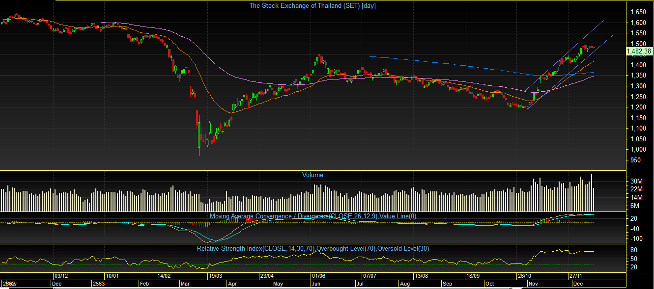 ตลอดทั้งสัปดาห์ที่ผ่านมา ดัชนีตลาดหุ้นไทย (SET index) ยังพุ่งทะยานขึ้นมาอย่างต่อเนื่อง ด้วยอานิสงค์กระแสเงินทุนต่างชาติ (Fund Flows) ไหลเข้า อย่างไรก็ตามช่วงปลายสัปดาห์ เริ่มเห็นแรงเทขายทำกำไรออกมา เนื่องจากไร้ปัจจัยใหม่ๆเข้ามาหนุนส่ง และนอกจากนั้น กำลังจะเข้าสู่ช่วงหยุดยาวเทศกาลคริสมาส และ ปีใหม่ จึงได้เห็นนักลงทุนเทขายกำไร เพื่อลดความเสี่ยง และในวันศุกร์ ดัชนีปิดตัวไปที่ระดับ 1482 จุด -1.51 จุด วันนี้มาติดตามกันต่อ ว่าดัชนีจะสามารถยืนเหนือ 1500 จุด ได้หรือไม่