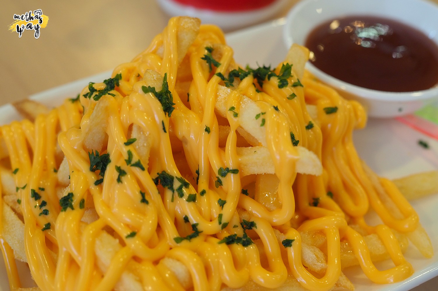 มีความโรยผงชีสก่อน แล้วตามมาด้วยชีสแบบราด แล้วราดมาแบบเยอะมากแม่