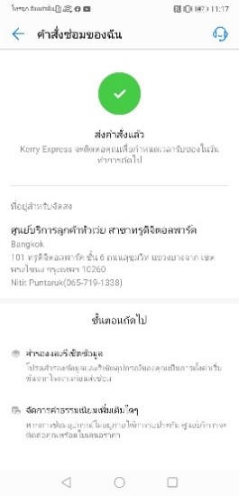 เราใช้บริการส่งเครื่องซ่อม เป็นอีกหนึ่งบริการของหัวเว่ย บริการนี้ไม่ต้องเดินทางไปที่ศูนย์บริการ จะมีเจ้าหน้าที่มารับเครื่องถึงหน้าบ้านเลย โดยไม่เสียค่าใช้จ่ายใดๆ (ไม่เกี่ยวกับค่าซ่อมนะคะ )