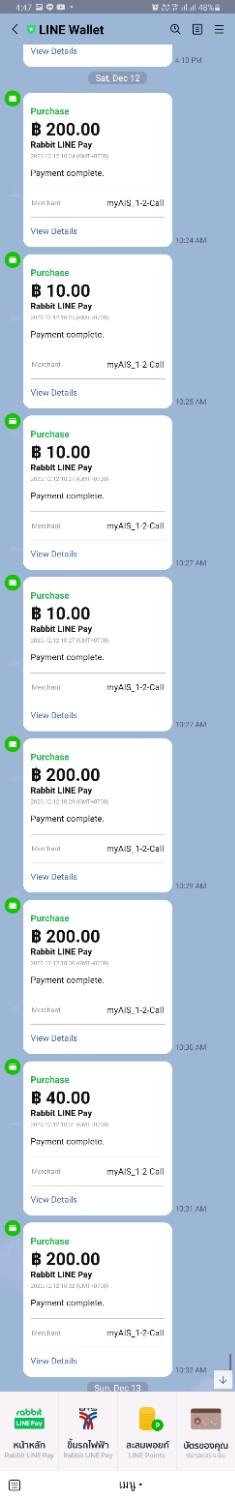call center บอกเราว่าให้โทรไปที่ line pay เราทำการโทรไป เค้าบอกว่า ไม่สามารถเช็คได้เพราะเกิน 48 ชม. แล้ว แต่เนื่องจากความดีของ line wallet ทำให้เวลาจ่ายเงินผ่าน line ทุกครั้งจะมีข้อความเข้ามาใน line และกดเข้าไปดูรายละเอียดได้ ทำให้เราเห็นว่ามีการจ่ายเงินให้กับ AIS 1 to call กี่บาท ไปเบอร์ไหนบ้าง กี่ครั้ง ซึ่งเราแนบบรูปมาด้วย