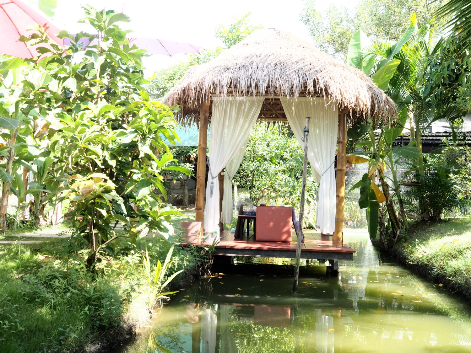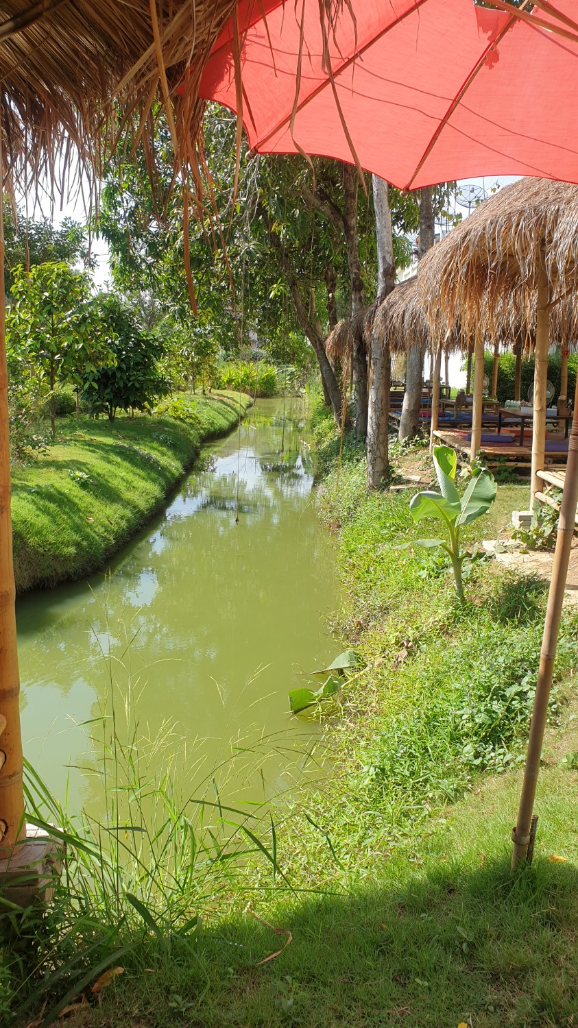 บรรยากาศภายในร้านร่มรื่นมากๆค่ะ เป็นร้านอยู่ในสวน มีทั้งส่วนที่เป็นนั่งโต๊ะทานปกติ และเป็นศาลาติดคูน้ำแบบในภาพนะคะ