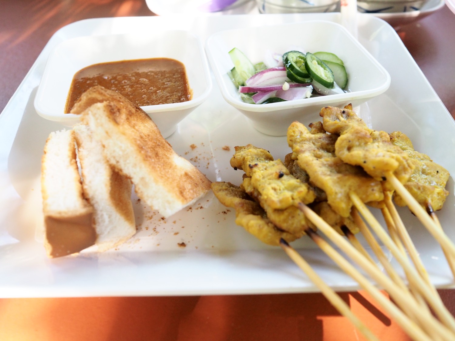 หมุสะเต๊ะ ก็เป็นอีก 1 เมนู ที่ไม่ควรพลาดค่ะ หมูเนื้อนิ่มหอมหวานกำลังดี เป็นหมูติดมัน ไม่ใช่หมูเสียบสลับกับมันหมู น้ำจิ้มหอมถั่ว ไม่หวานเลี่ยน กลมกล่มกำลังพอดี (แต่เราแอบคิดว่า หมูไม้เล็กไปสำหรับเรา เรากินไม่อิ่ม 555 ) ในส่วนของขนมปังก็ปิ้งมากรอบดีค่ะ ไม่เหนียว