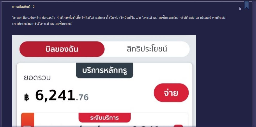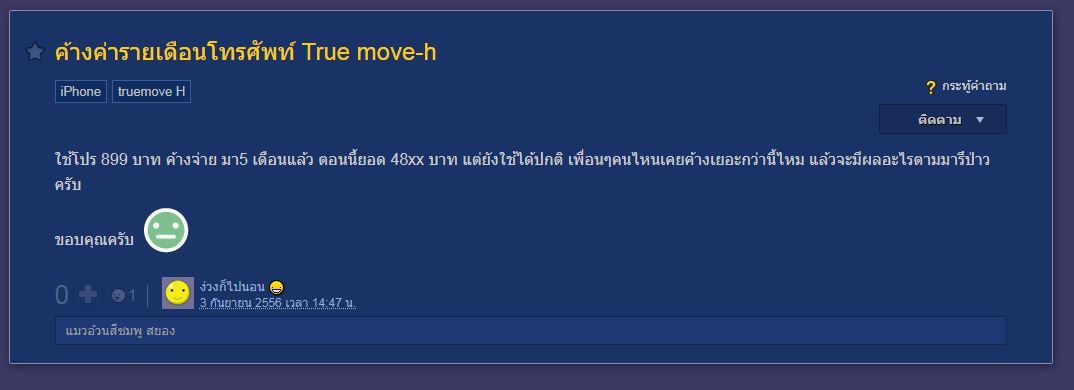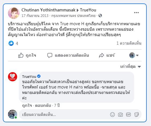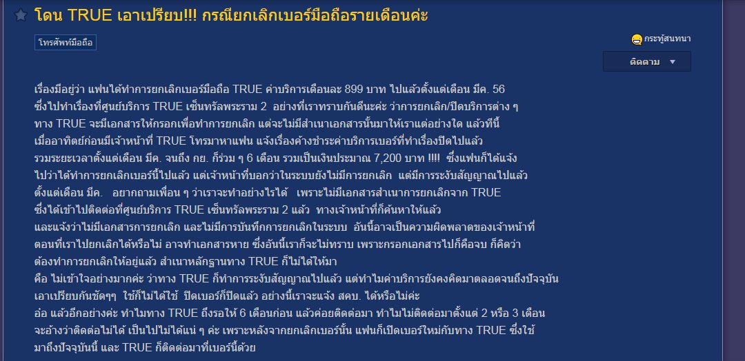 ทรูมูฟเอช เอาเปรียบผู้บริโภค จากที่ผมโดนถูกเรียกเก็บค่าบริการอย่างต่อเนื่องหลังจากโดนระงับญาณ และไม่ได้ใช้บริกการแล้ว ผมเลยพบว่ายังมีอีกหลายผู้ใช้บริการจำนวนมากที่ โดนเรียกเก็บค่าบริการ มีทั้งที่บอกว่ายกเลิกไปแล้ว ระงับสัญญาณไปแล้ว แต่ก็ถูกเก็บค่าบริการต่อเนื่องทุกเเดือน และจะทบยอดขึ้นเรื่อยๆ ผมคิดว่านี่คือการเอาเปรียบผู้ใช้บริการเป็นอย่างมาก ผู้ใช้ทำอะไรได้บ้างจากกรณีนี้ ทรูมูฟไม่น่าหารายได้จากช่องโหว่แบบนี้