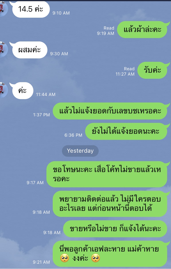 เรื่องมีอยู่ว่า เราเห็นเสื้อโค้ททางไอจีค่ะ เลยไลร์ไปถามแม่ค้า ถามแค่สองอย่างคือไหล่เสื้อเท่าไหร่ และเนื้อผ้าอะไร เพราะในโพสต์มันไม่มี