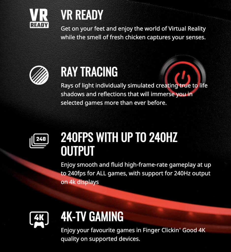 นั่นหมายความว่าชาวเกมเมอร์อาจจะเอาเครื่องอุ่นไก่นี้มาเล่นเกมส์ Crysis หรือ Cyberpunk 2077 (ทั้ง 2 เกมส์นี้เป็นเกมส์ที่ขึ้นชื่อเรื่องการกินทรัพยากรณ์เครื่องคอมพิวเตอร์เป็นอย่างมากครับ ตัวเครื่องเกมส์ที่มีประสิทธิภาพปานกลางอาจเล่นแล้วติดขัดได้) ที่ความละเอียด 4K ที่ความถี่ภาพถึง 240FPS