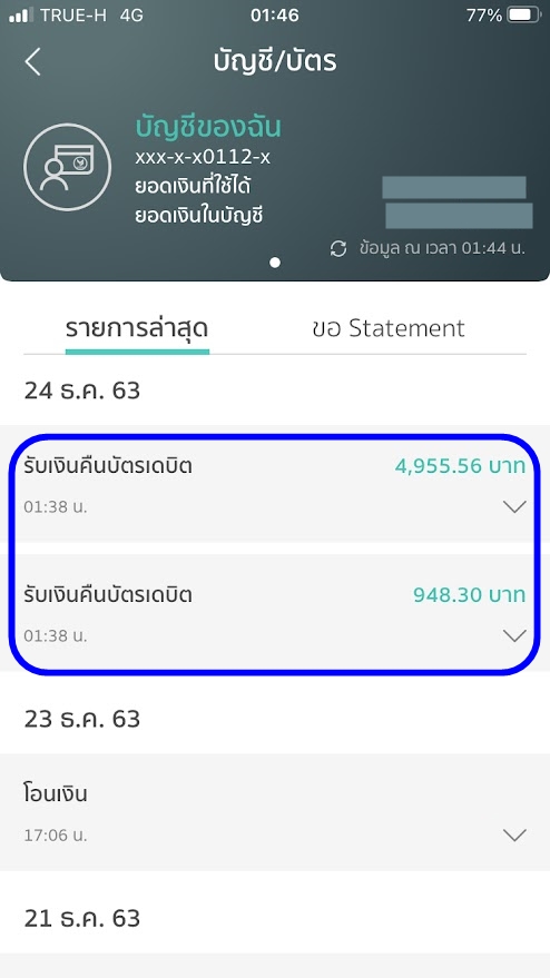 มันไม่ใช่การโอนเงินเข้าบัญชี มันขึ้นว่า รับเงินคืนจากบัตรเดบิต