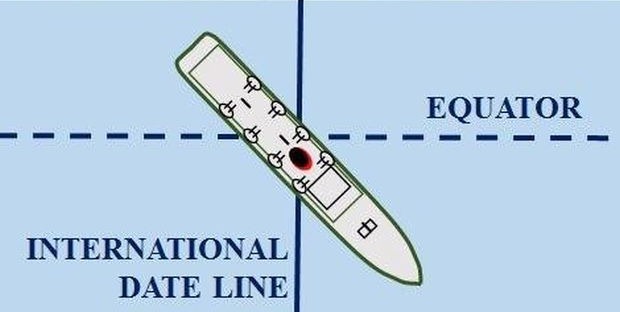 กล่าวอีกนัยหนึ่งก็คือ พวกเขาอยู่ใกล้เส้นศูนย์สูตรและจุดที่บรรจบกับเส้นเขตวันสากล (International Date Line) อย่างมาก เมื่อได้ยินรายงานจากนักเดินเรือ First Mate Payton ได้สังเกตเห็นลักษณะที่น่าสนใจของตำแหน่งของพวกเขาจึงไปบอกกับกัปตัน John Phillips ซึ่ง Phillips ก็ตระหนักว่ามัน