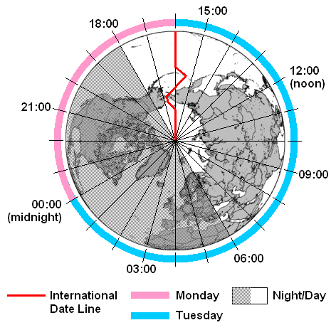 ดังนั้น หากเป็นเวลา 9.00 น. ของวันจันทร์ เมื่อข้ามเส้นวันระหว่างประเทศ เวลาและวันที่ในช่วงเวลาถัดไปจะเป็น 9.00 น.ของวันอังคาร ซึ่งจะสูญเสียเวลาไป 24 ชั่วโมงทันที