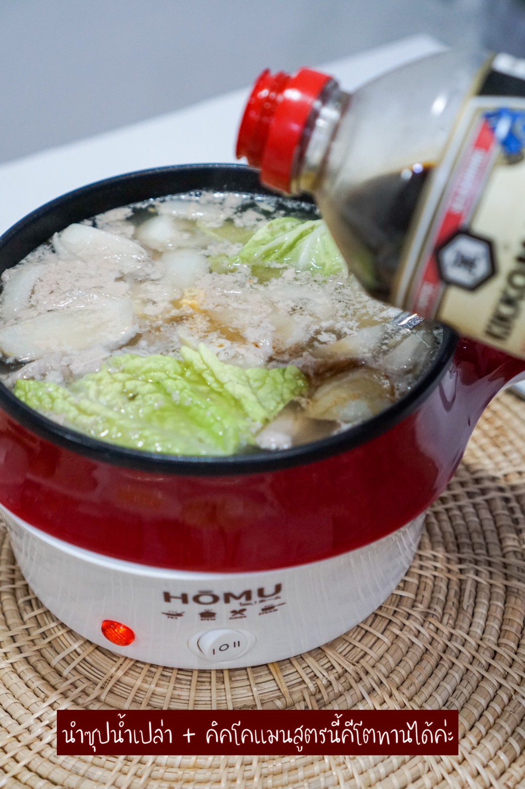 1. น้ำซุป คิคโคแมน ซอสถั่วเหลือง เราใช้สูตร สีน้ำเงินเเดงค่ะ เป็นสูตรที่มีน้ำตาลน้อยกว่า 1 กรัม ใส่ไปพร้อมกับน้ำและ หอมหัวใหญ่ ประมาณ 1/2 ลูกก็พอค่ะสำหรับหม้อนี้