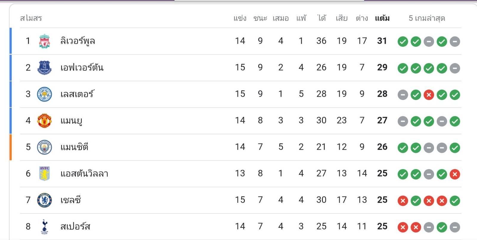 ตารางคะแนนเลสเตอร์ร่วงมาเป็นที่สาม โดนเอฟฯที่ชนะเกมเมื่อคืนแซงขึ้นมารั้งอันดับสองแทน