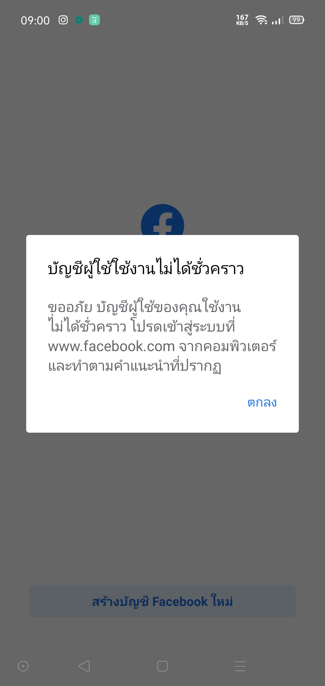 คุณไม่สามารถใช้ฟีเจอร์นี้ได้ในขณะนี้ facebook ขึ้นเเบบนี้ มันเกิดอะไรขึ้น ผมไม่สามารถล็อกอินเข้าเฟสได้ครับ ใครมีวิธีเเก้บอกหน่อยครับ