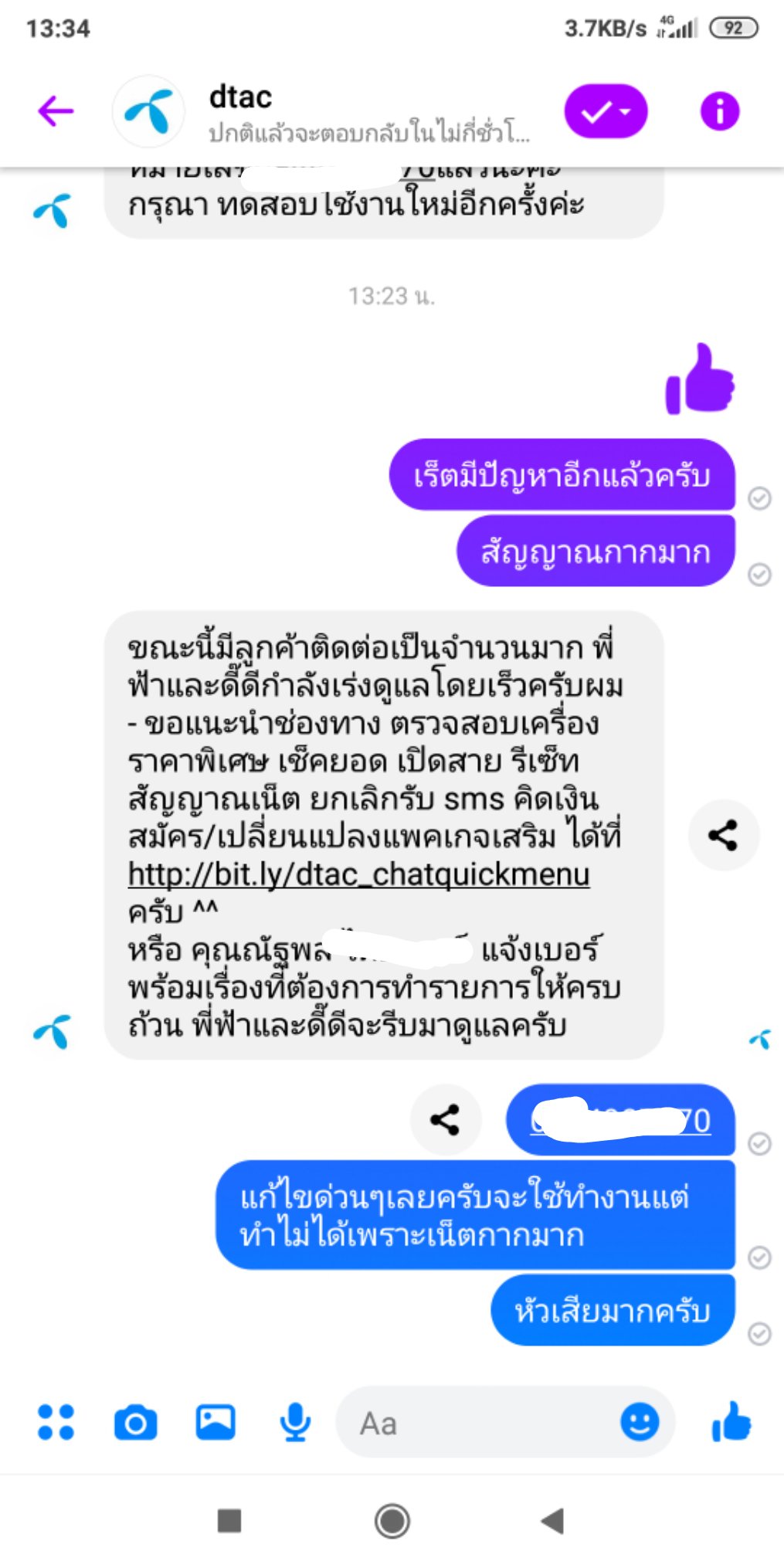 Dtac เน็ตห่วยมาก โทรหาเจ้าหน้าที่ก็มีมีแต่ข้อความอัตโนมัติ เคยมาโพสต์ไปแล้ว 1 ครั้ง ก็แค่รีสัญญาณเน็ต ก็ยังเป็นอยู่ ทั้งช้า ทั้งค้าง เน็ต 5G แท้ๆ รบกวนติดต่อมาหน่อยเถอะ ไม่ใช่แค่รีสัญญาณเน็ต