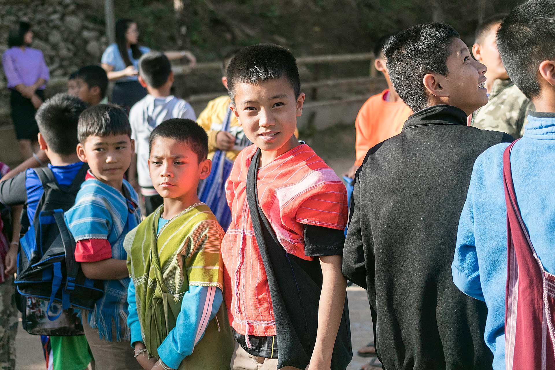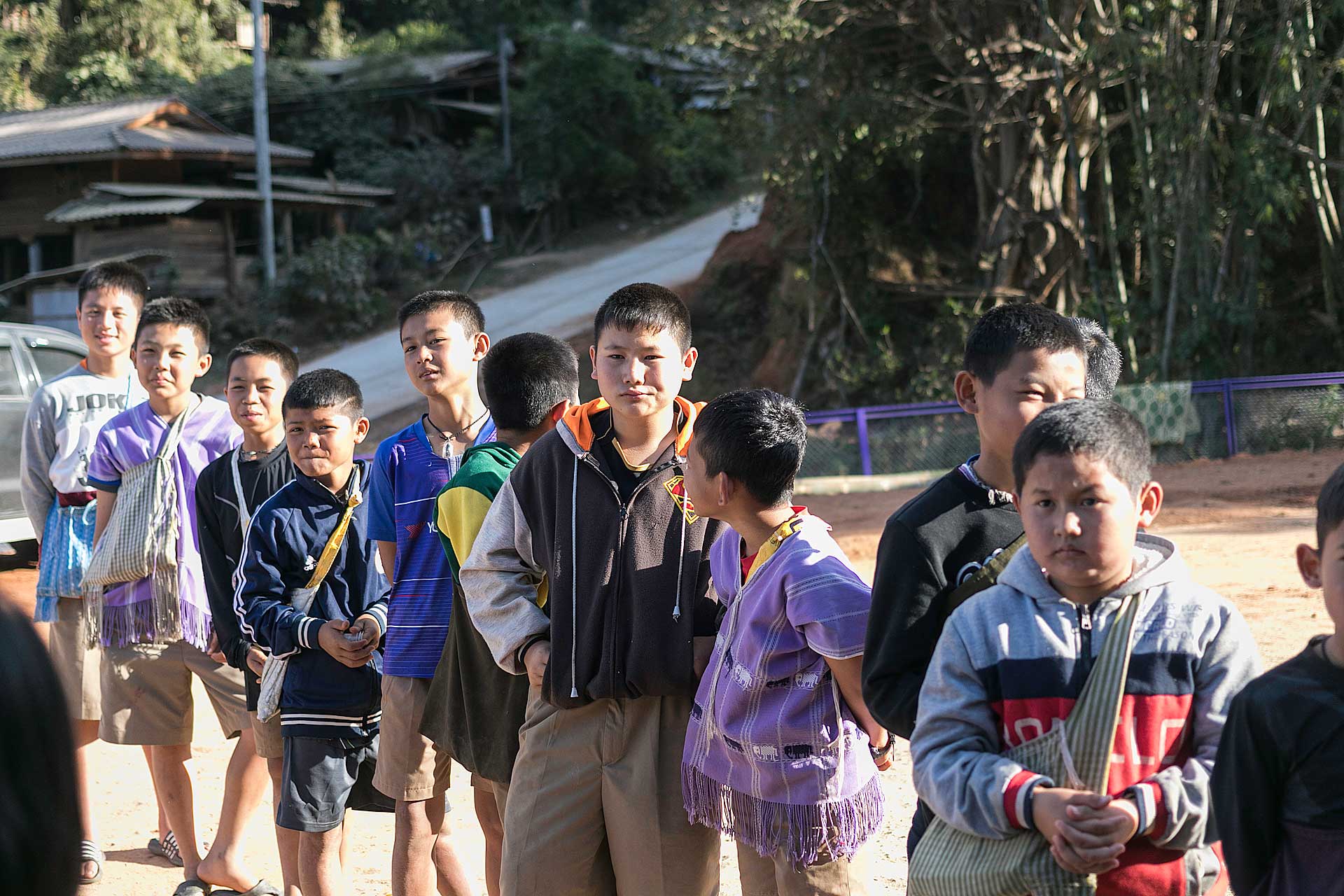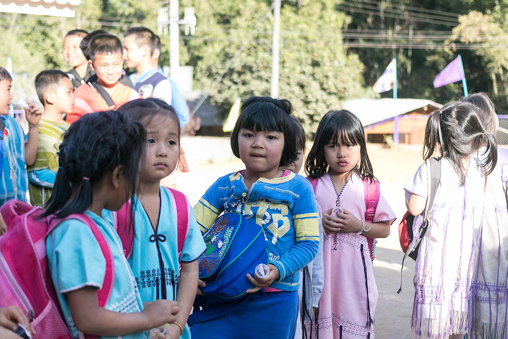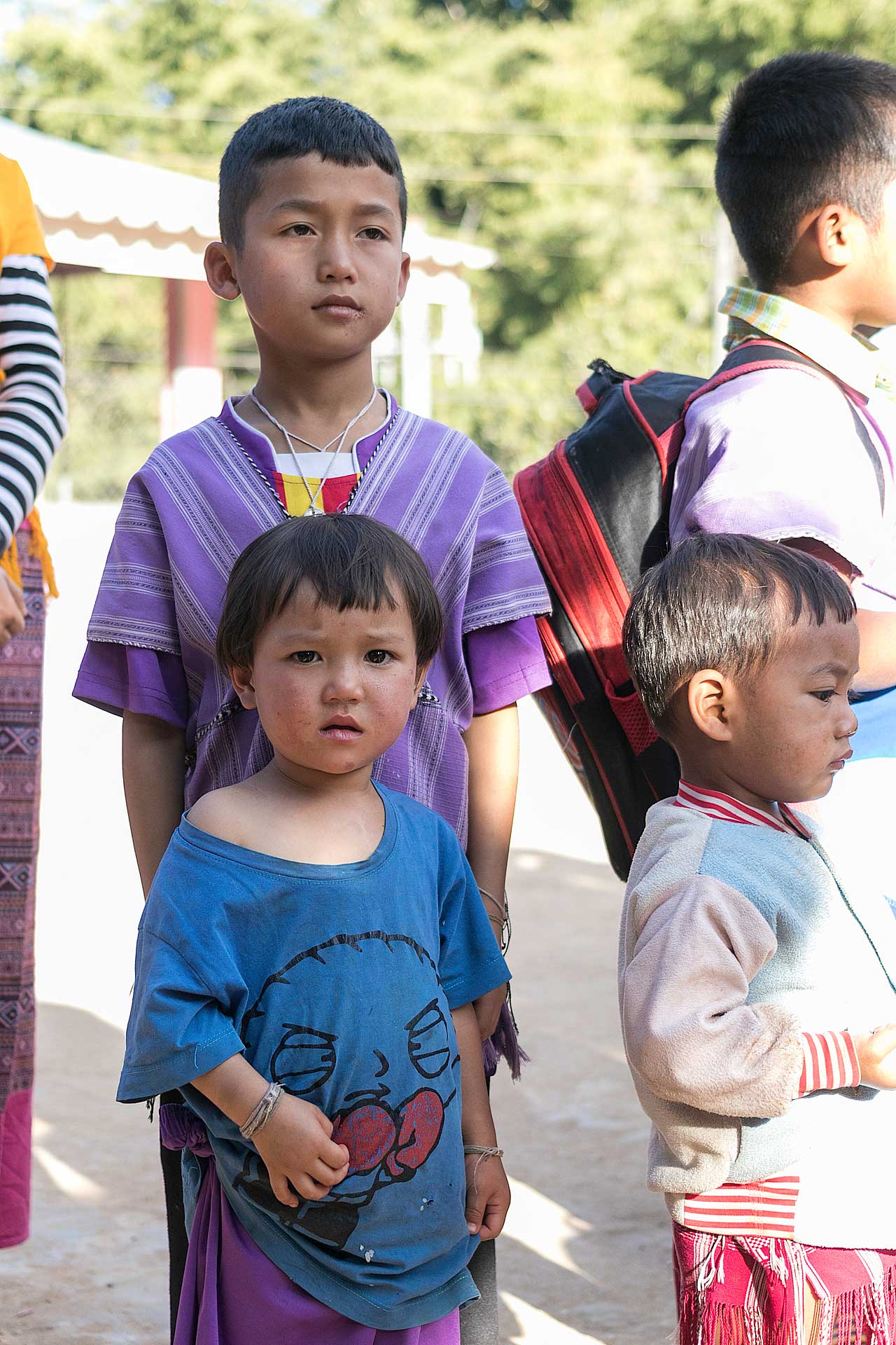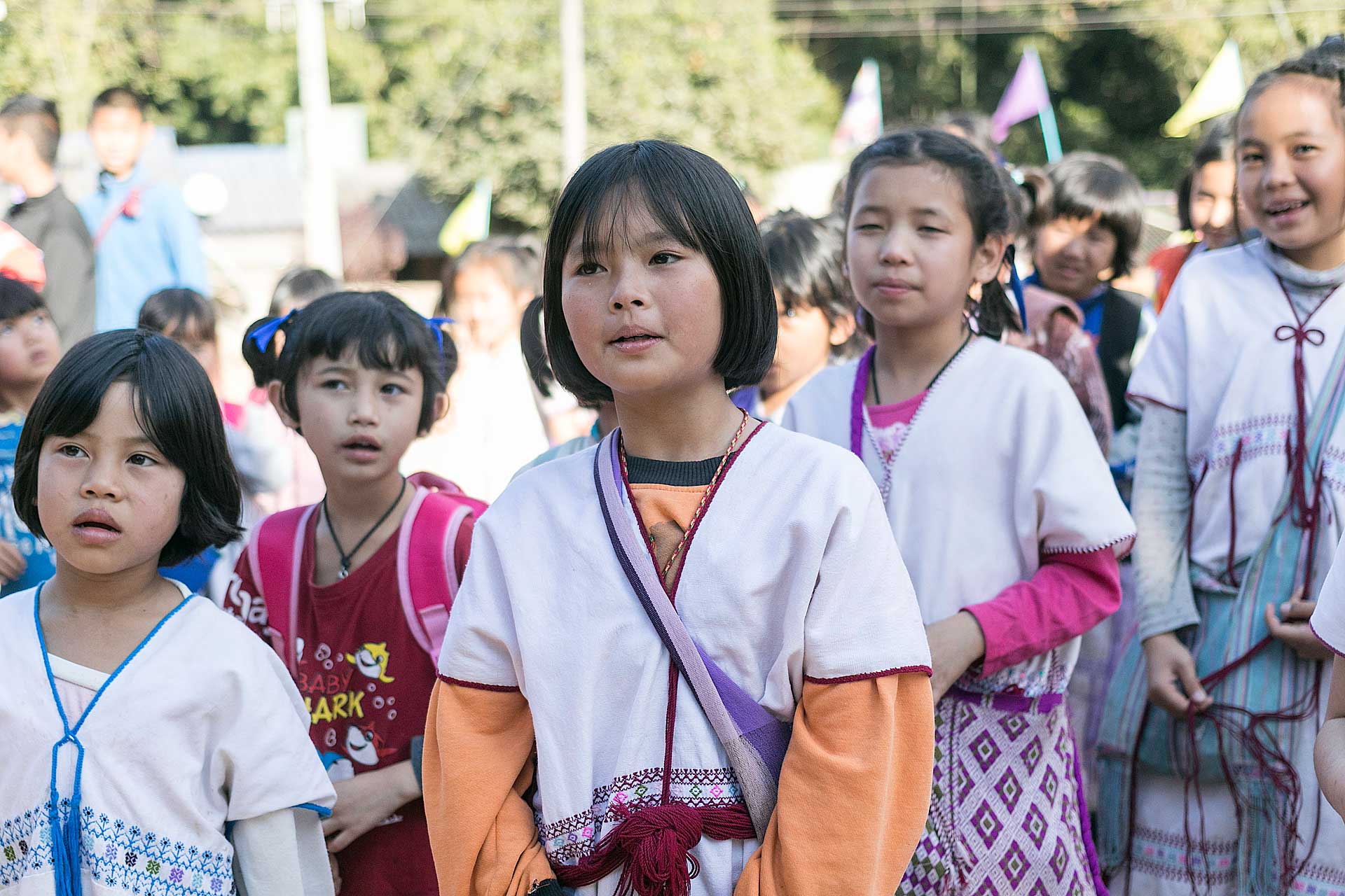 เด็กๆใส่ชุดพื้นเมืองกันเป็นส่วนใหญ่ (สอบถามจากอาจารย์ทราบว่าทุกวันศุกร์ทางโรงเรียนจะให้ใส่ชุดพื้นเมือง) แต่ก็ใช่ว่าทุกคนจะใส่ บางคนก็ใส่ชุดไปรเวท เสื้อยึด ผมสังเกตเห็นหลายคนใส่เสื้อกันหนาวด้านในทับด้วยเสื้อชุดพื้นเมือง (อากาศคงจะหนาวน่าดู) บางคนใส่รองเท้าแตะ ถุงเท้ามีน้อยคนมากที่ใส่ เด็กนักเรียนผู้หญิงไม่ได้ใส่รองเท้าหนังที่เป็นรองเท้านักเรียนหญิง แต่ใส่ร้องเท้าผ้าใบนักเรียนชาย