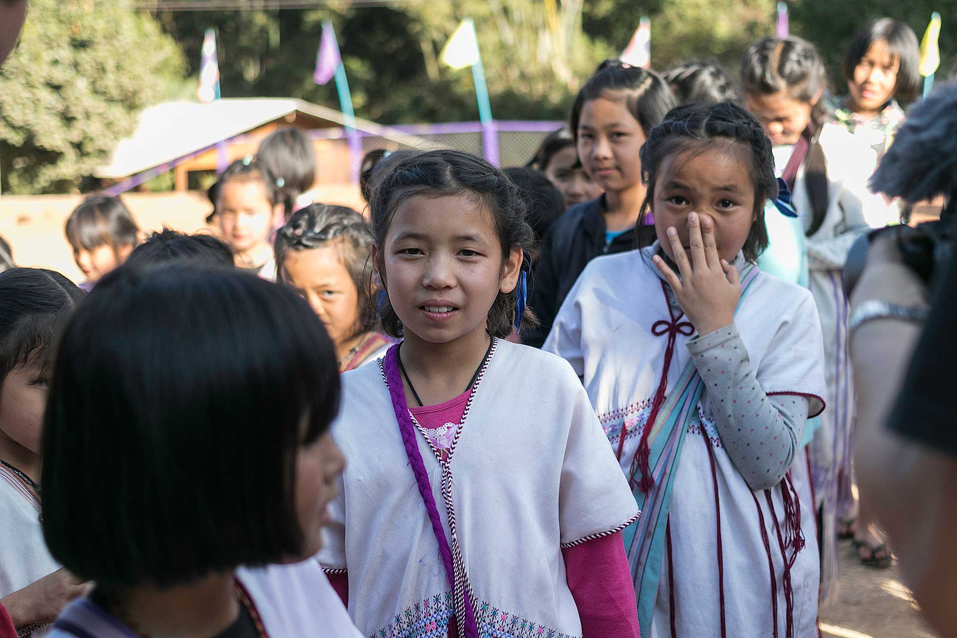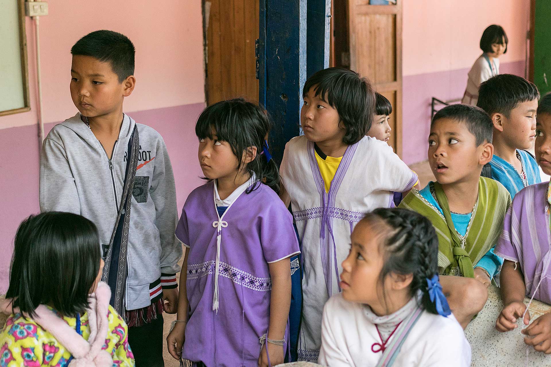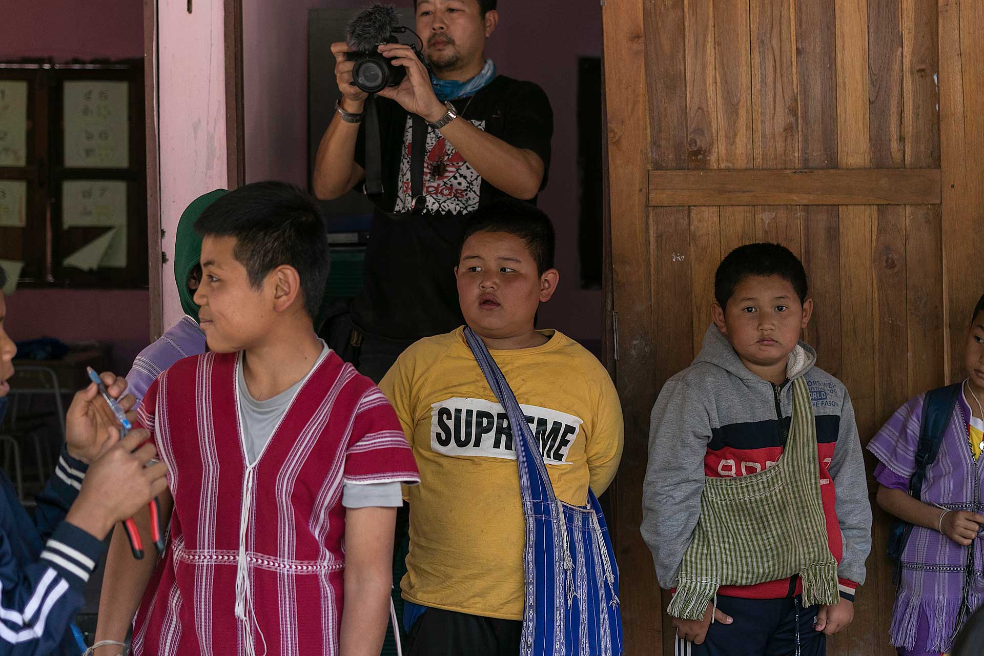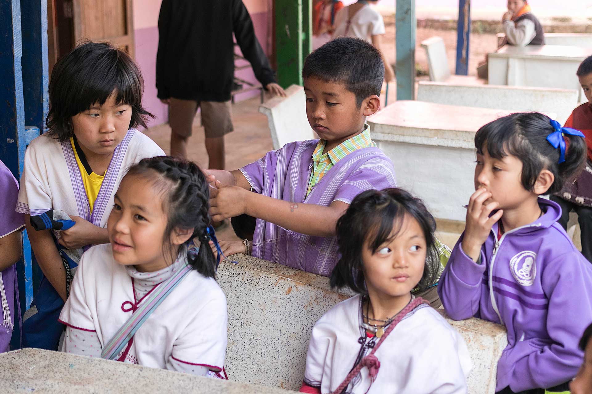 เด็กๆใส่ชุดพื้นเมืองกันเป็นส่วนใหญ่ (สอบถามจากอาจารย์ทราบว่าทุกวันศุกร์ทางโรงเรียนจะให้ใส่ชุดพื้นเมือง) แต่ก็ใช่ว่าทุกคนจะใส่ บางคนก็ใส่ชุดไปรเวท เสื้อยึด ผมสังเกตเห็นหลายคนใส่เสื้อกันหนาวด้านในทับด้วยเสื้อชุดพื้นเมือง (อากาศคงจะหนาวน่าดู) บางคนใส่รองเท้าแตะ ถุงเท้ามีน้อยคนมากที่ใส่ เด็กนักเรียนผู้หญิงไม่ได้ใส่รองเท้าหนังที่เป็นรองเท้านักเรียนหญิง แต่ใส่ร้องเท้าผ้าใบนักเรียนชาย