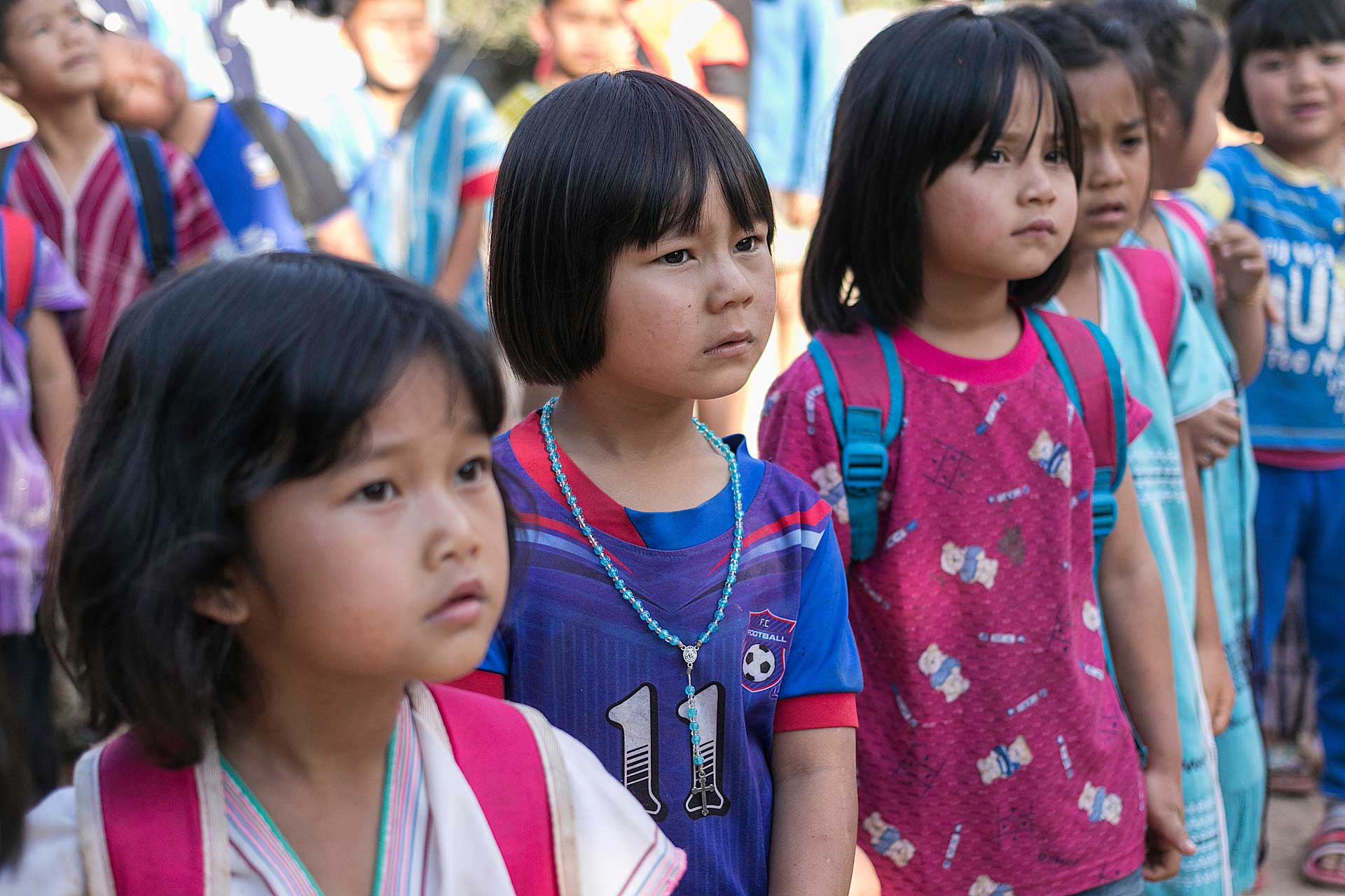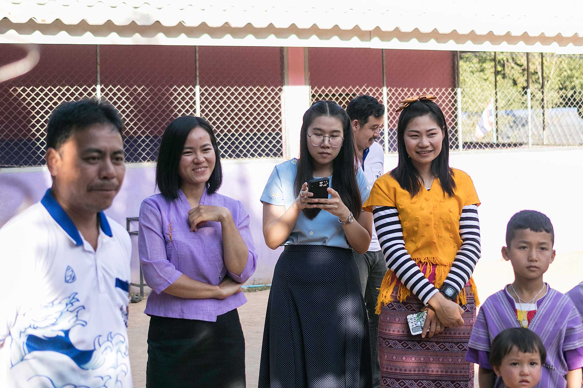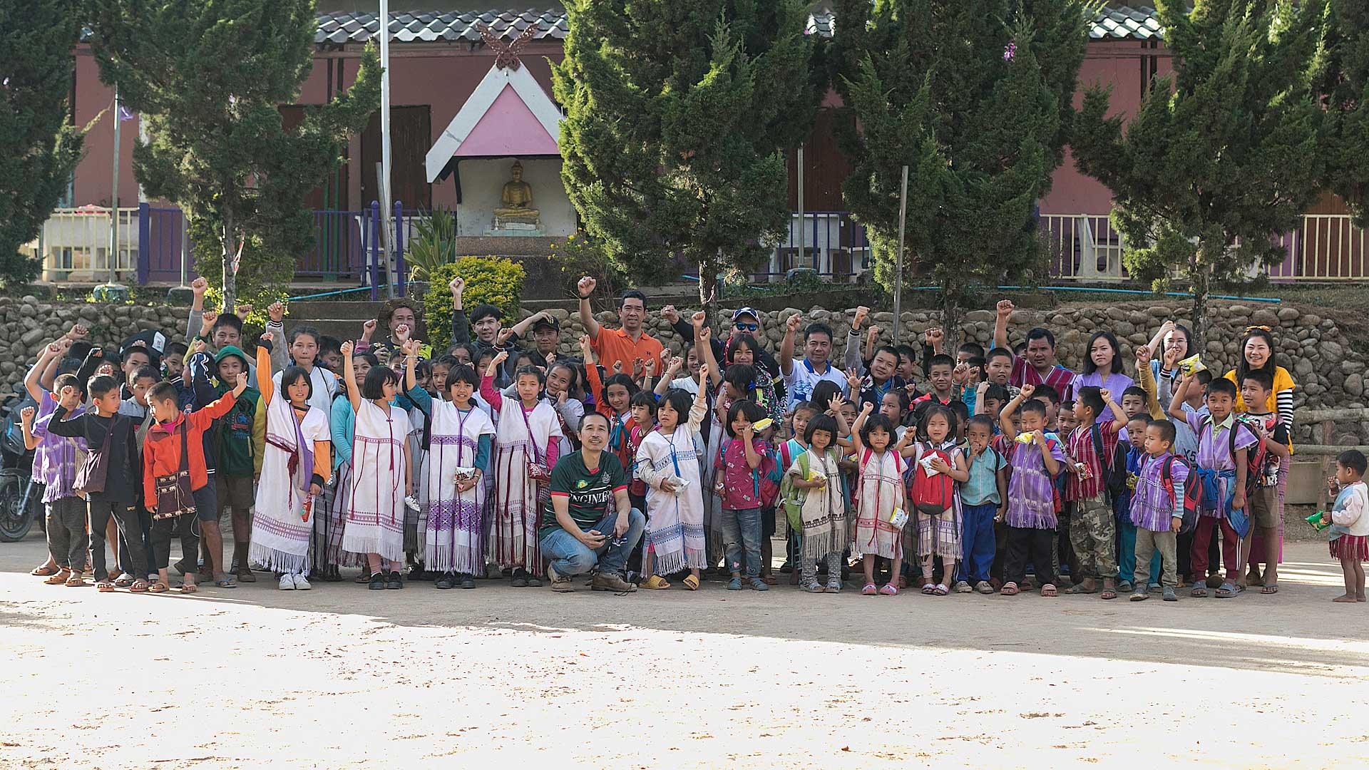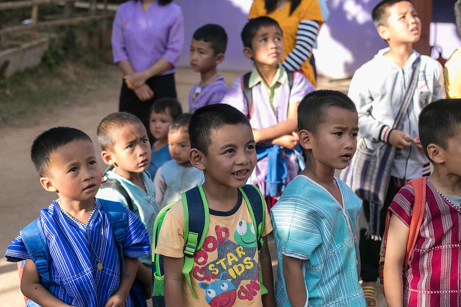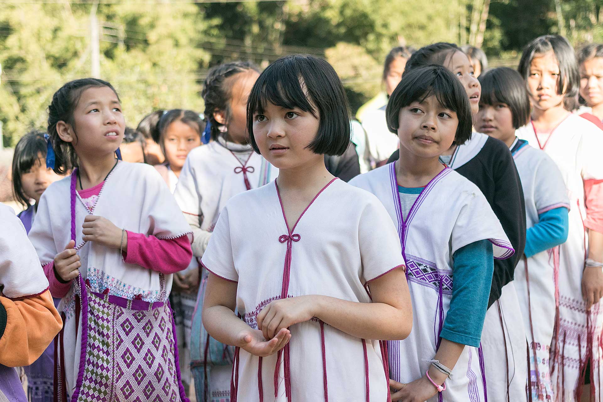 เด็กๆใส่ชุดพื้นเมืองกันเป็นส่วนใหญ่ (สอบถามจากอาจารย์ทราบว่าทุกวันศุกร์ทางโรงเรียนจะให้ใส่ชุดพื้นเมือง) แต่ก็ใช่ว่าทุกคนจะใส่ บางคนก็ใส่ชุดไปรเวท เสื้อยึด ผมสังเกตเห็นหลายคนใส่เสื้อกันหนาวด้านในทับด้วยเสื้อชุดพื้นเมือง (อากาศคงจะหนาวน่าดู) บางคนใส่รองเท้าแตะ ถุงเท้ามีน้อยคนมากที่ใส่ เด็กนักเรียนผู้หญิงไม่ได้ใส่รองเท้าหนังที่เป็นรองเท้านักเรียนหญิง แต่ใส่ร้องเท้าผ้าใบนักเรียนชาย
