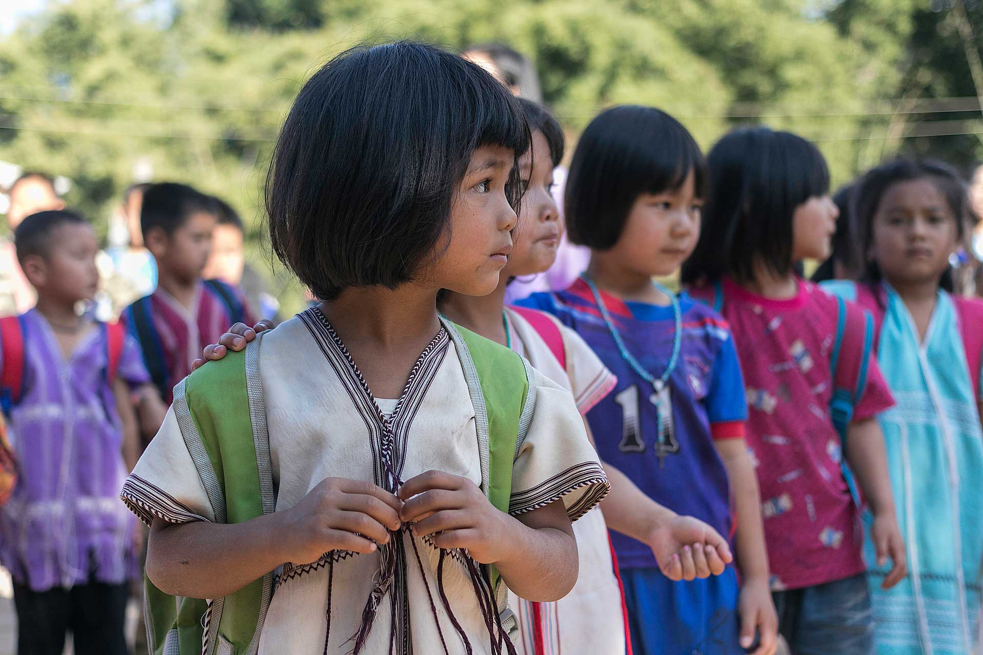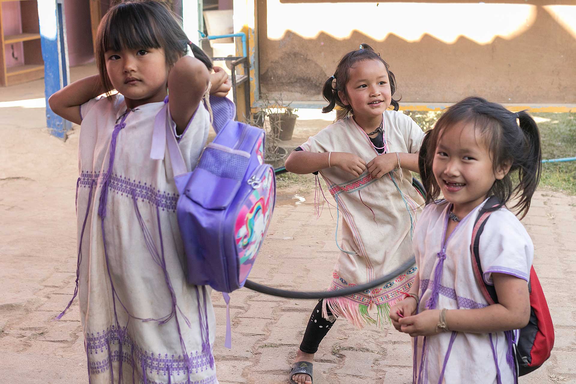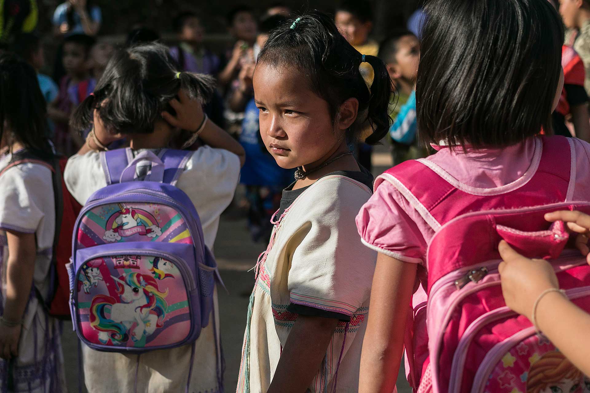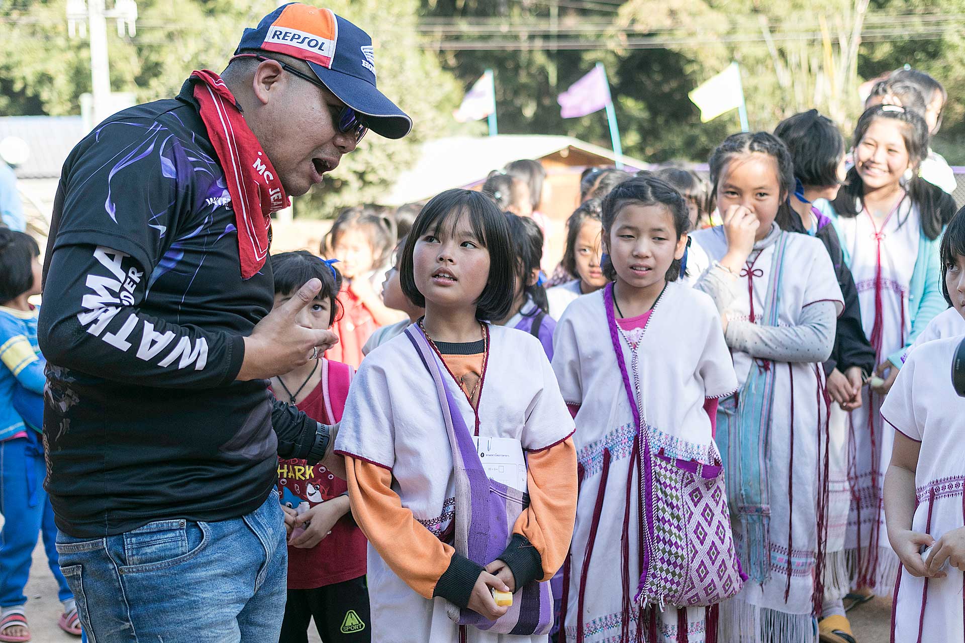 เด็กๆใส่ชุดพื้นเมืองกันเป็นส่วนใหญ่ (สอบถามจากอาจารย์ทราบว่าทุกวันศุกร์ทางโรงเรียนจะให้ใส่ชุดพื้นเมือง) แต่ก็ใช่ว่าทุกคนจะใส่ บางคนก็ใส่ชุดไปรเวท เสื้อยึด ผมสังเกตเห็นหลายคนใส่เสื้อกันหนาวด้านในทับด้วยเสื้อชุดพื้นเมือง (อากาศคงจะหนาวน่าดู) บางคนใส่รองเท้าแตะ ถุงเท้ามีน้อยคนมากที่ใส่ เด็กนักเรียนผู้หญิงไม่ได้ใส่รองเท้าหนังที่เป็นรองเท้านักเรียนหญิง แต่ใส่ร้องเท้าผ้าใบนักเรียนชาย