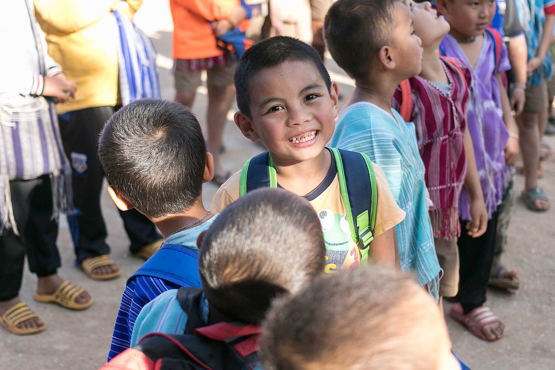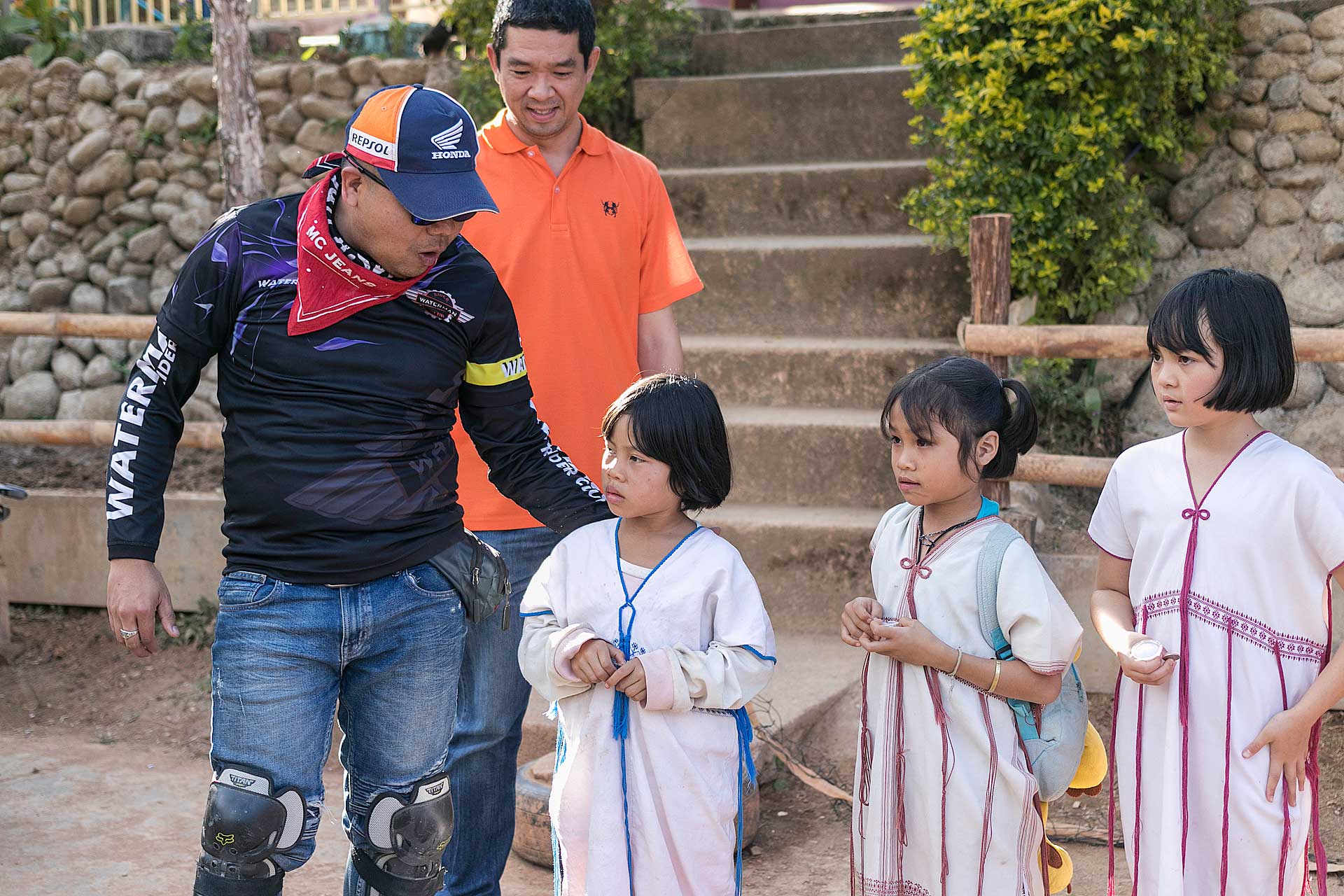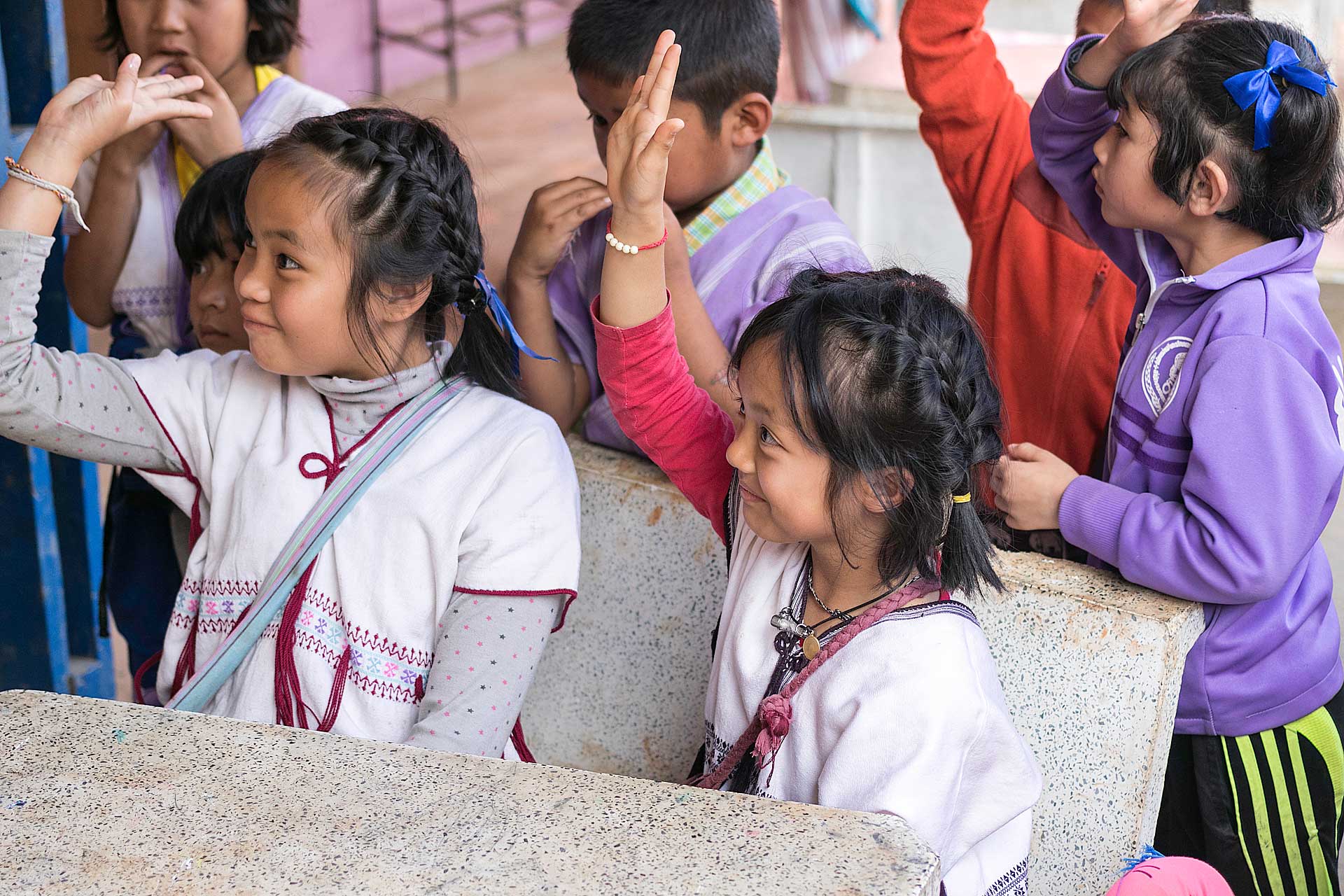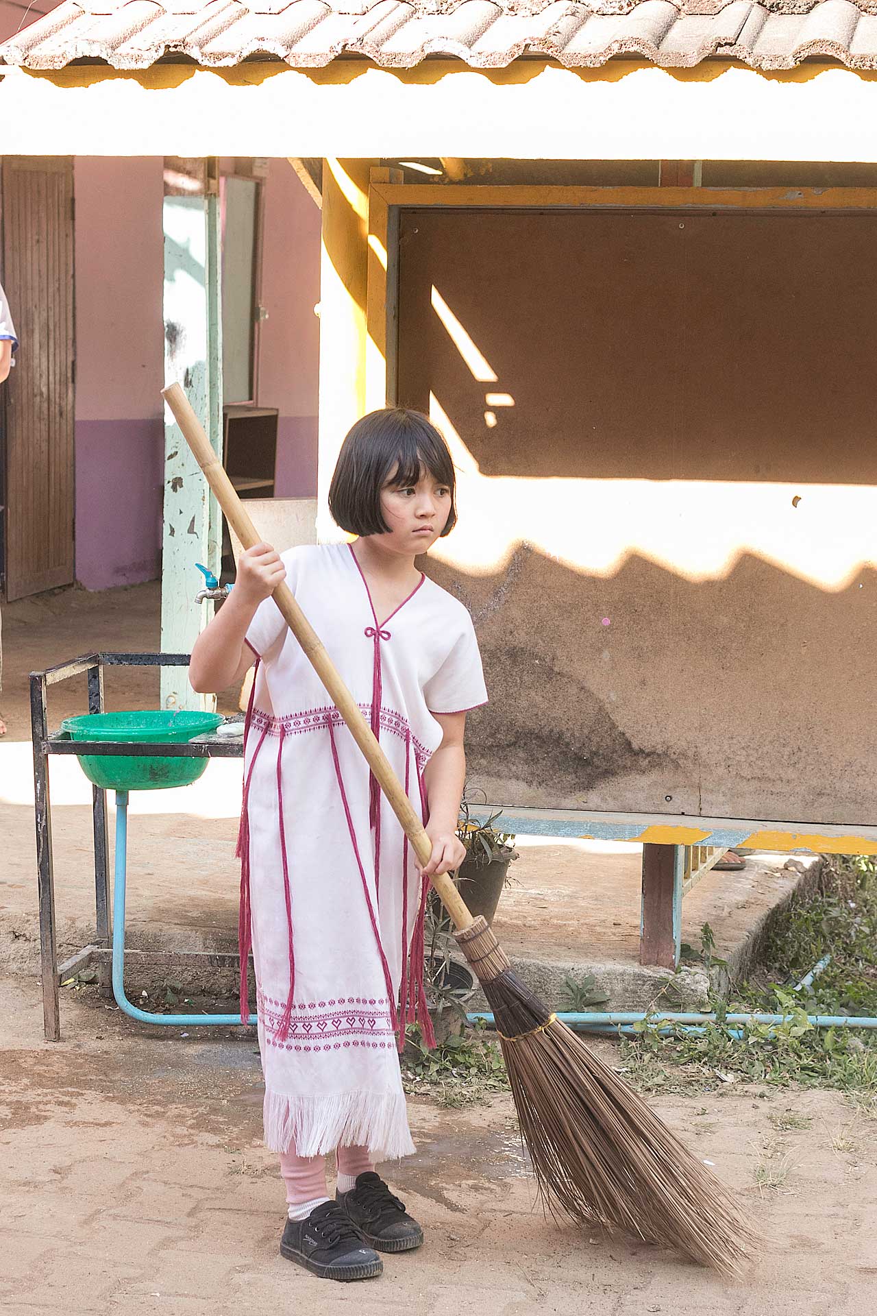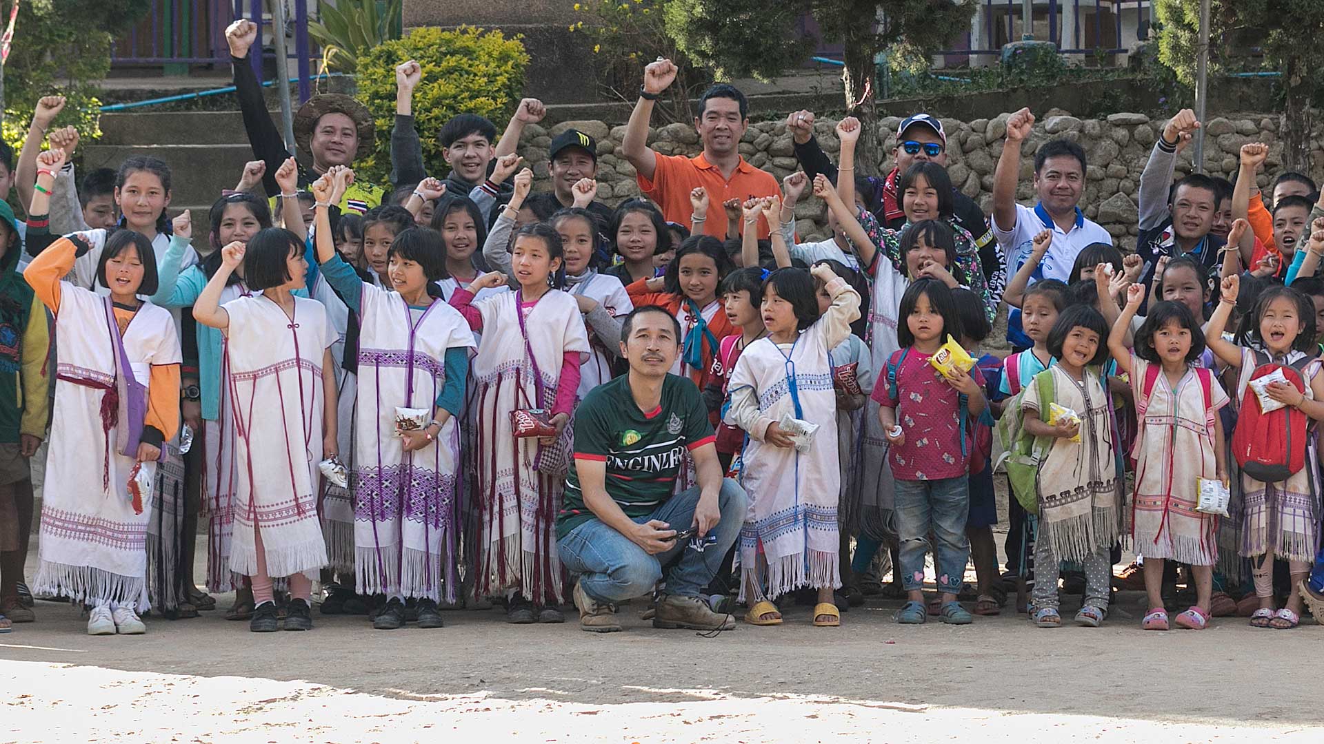 เด็กๆใส่ชุดพื้นเมืองกันเป็นส่วนใหญ่ (สอบถามจากอาจารย์ทราบว่าทุกวันศุกร์ทางโรงเรียนจะให้ใส่ชุดพื้นเมือง) แต่ก็ใช่ว่าทุกคนจะใส่ บางคนก็ใส่ชุดไปรเวท เสื้อยึด ผมสังเกตเห็นหลายคนใส่เสื้อกันหนาวด้านในทับด้วยเสื้อชุดพื้นเมือง (อากาศคงจะหนาวน่าดู) บางคนใส่รองเท้าแตะ ถุงเท้ามีน้อยคนมากที่ใส่ เด็กนักเรียนผู้หญิงไม่ได้ใส่รองเท้าหนังที่เป็นรองเท้านักเรียนหญิง แต่ใส่ร้องเท้าผ้าใบนักเรียนชาย