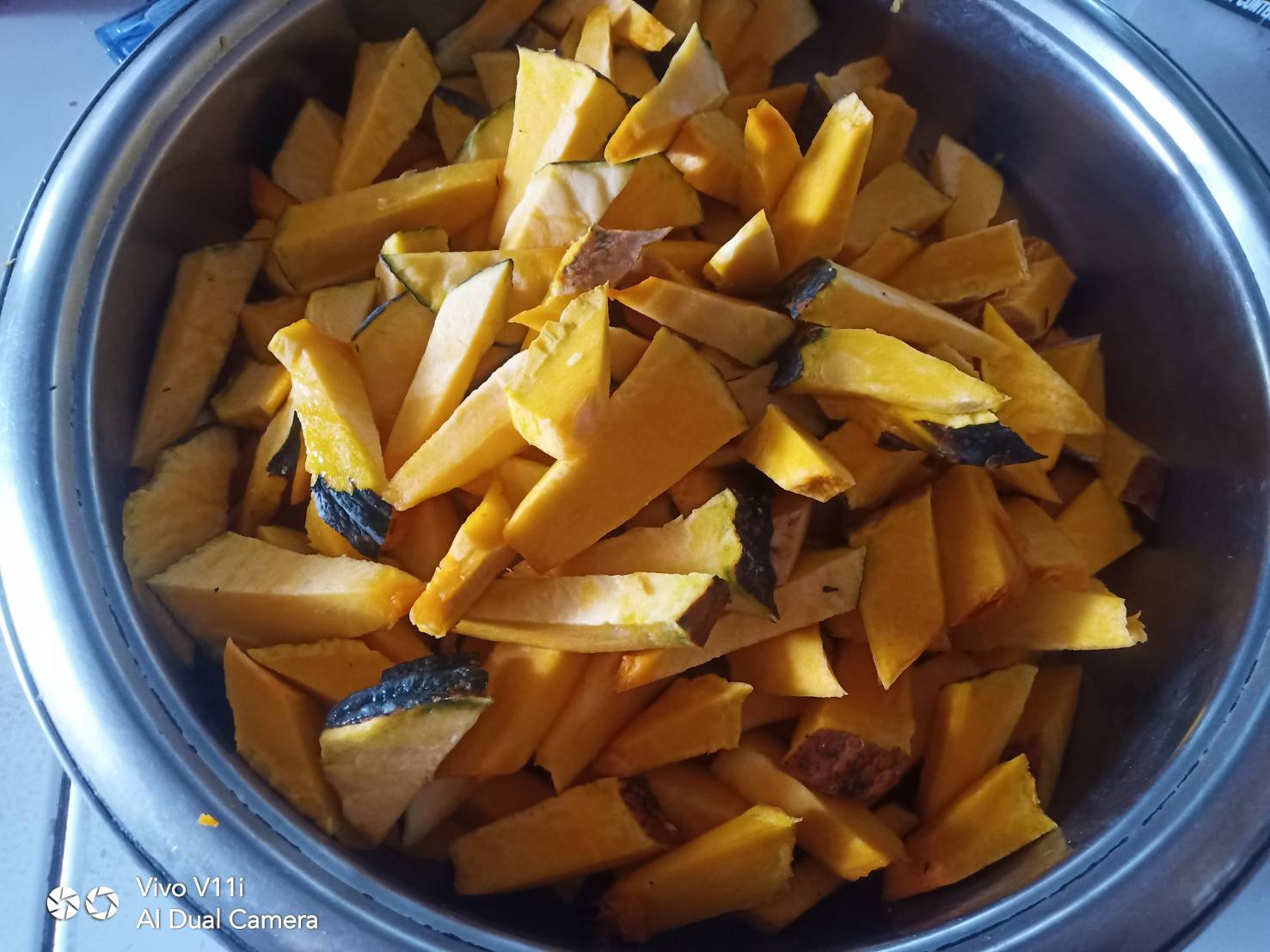 นำฟักทองมาล้างน้ำให้สะอาดแล้วนำมาหั่นเป็นชิ้นเล็กพอหั่นเสร็จแล้วเอาหม้อตั้งไฟใส่กระทิลงหม้อค่ะ