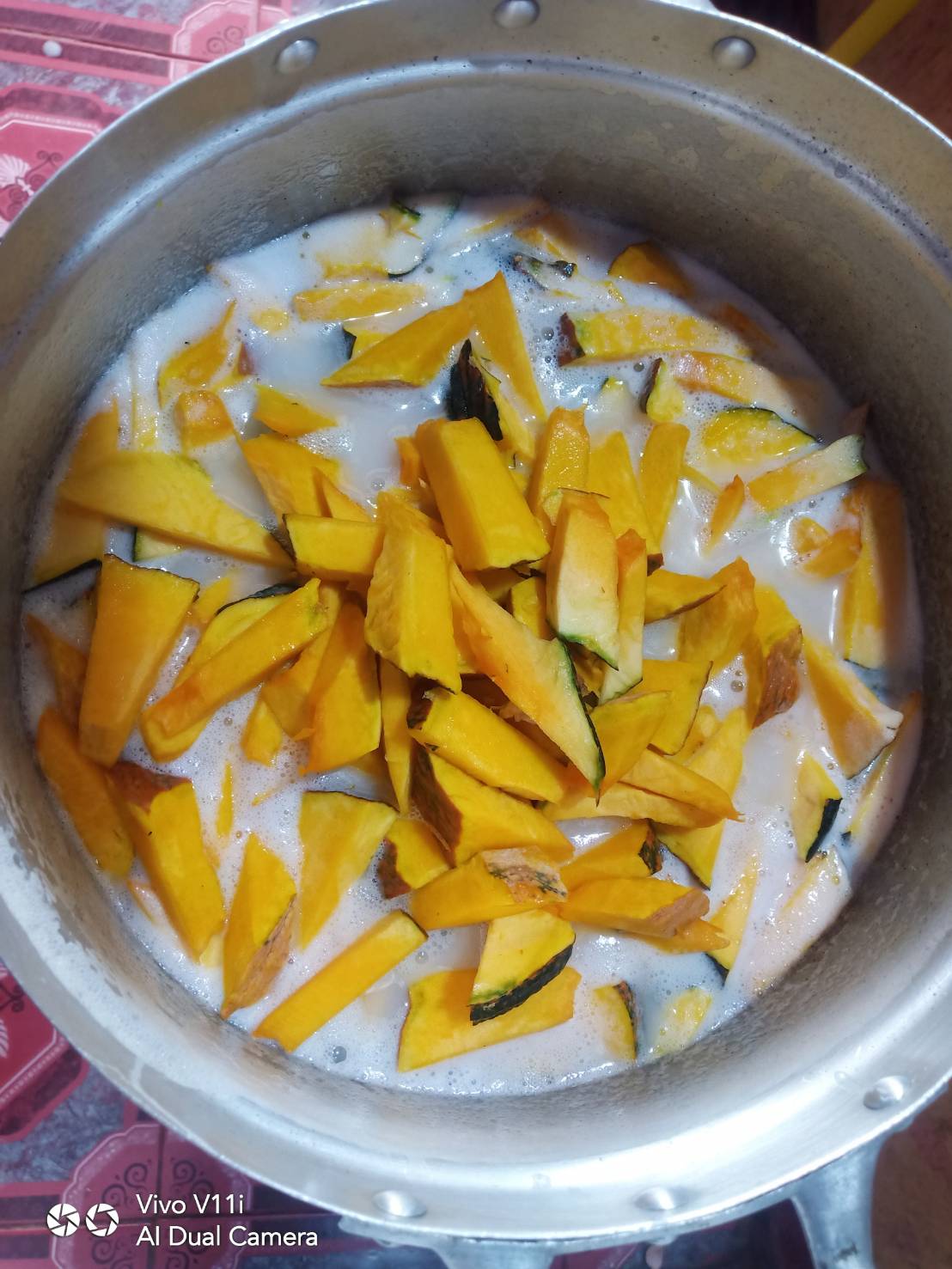 ใส่เกลือป่นลืมถ่ายรูปเกลือป่นมาให้ดูค่ะเปิดไฟเบาๆนะคะพอกระทิเดือดใส่ฟักทองลงไปรอเดือดอีกรอบแล้วตอกไข่ลงไปจนหมด5ฟองค่ะ