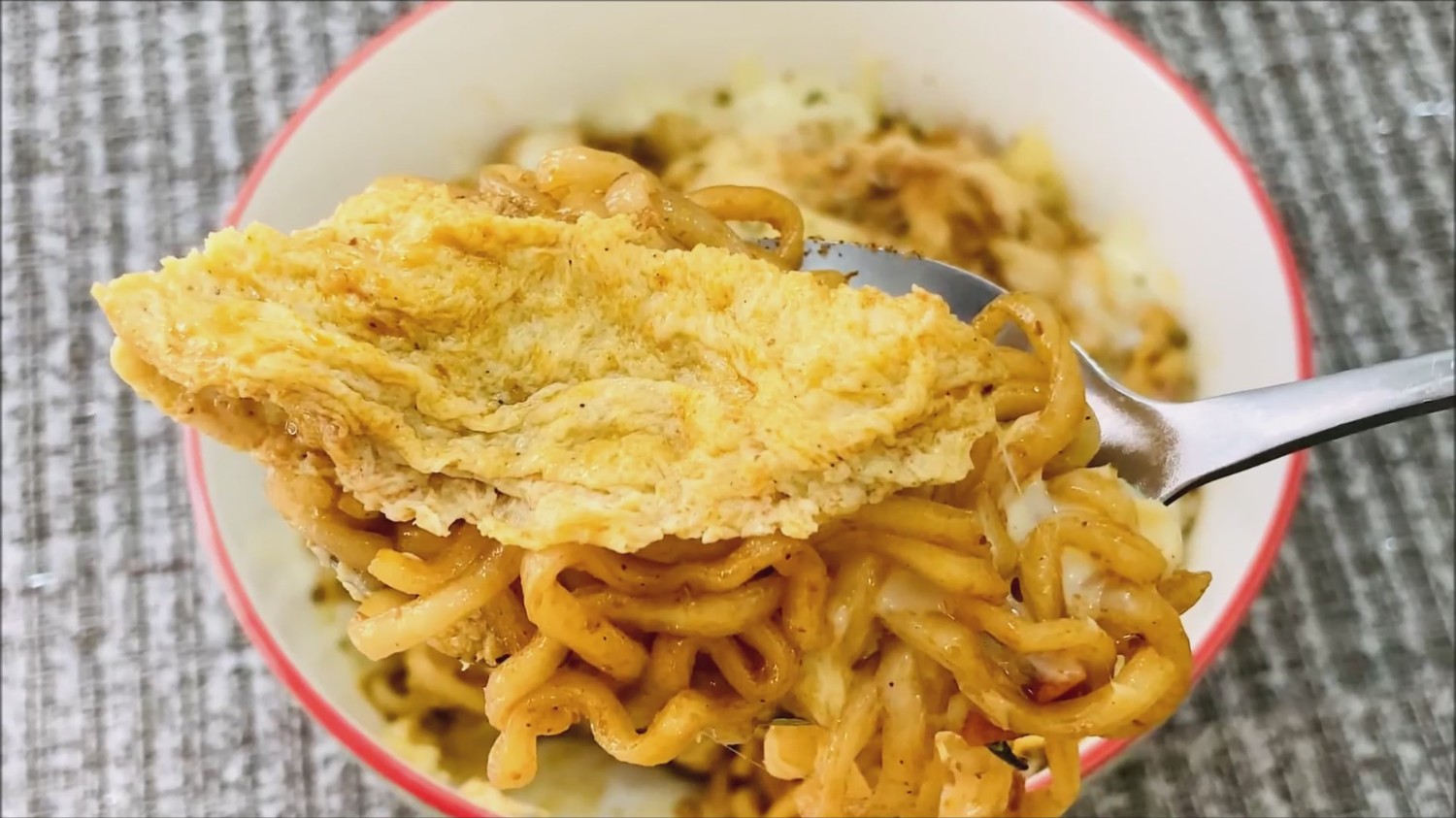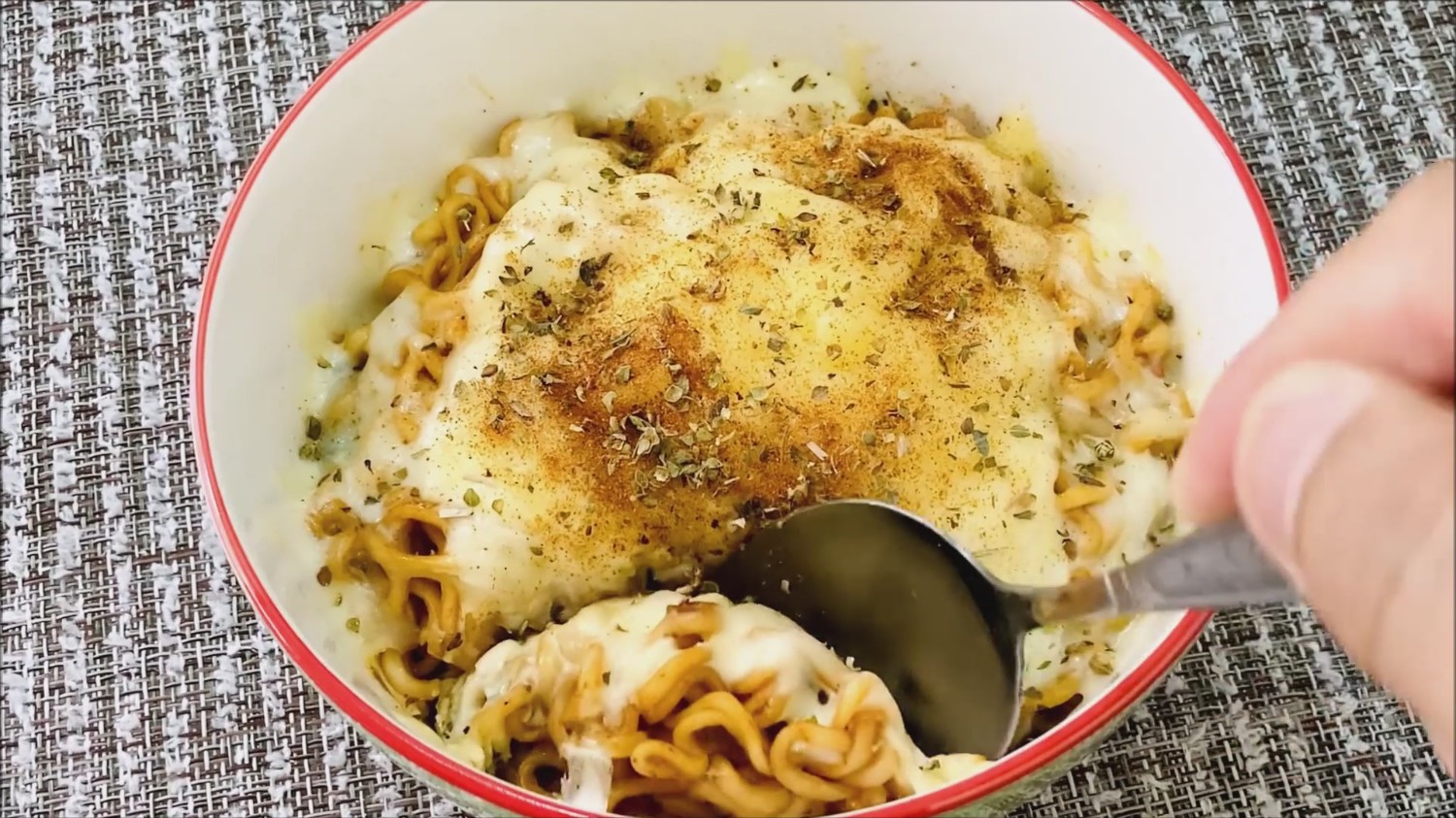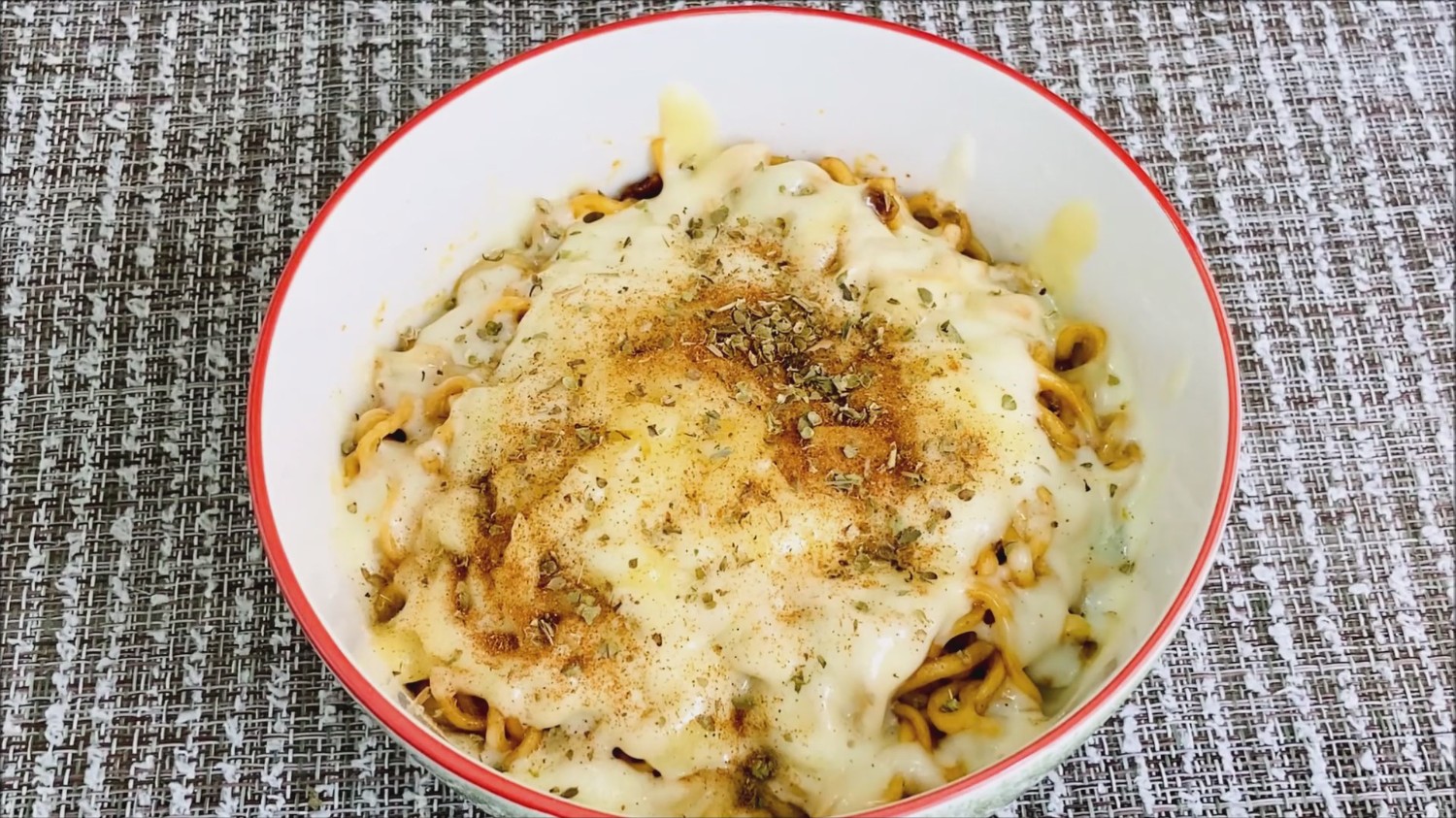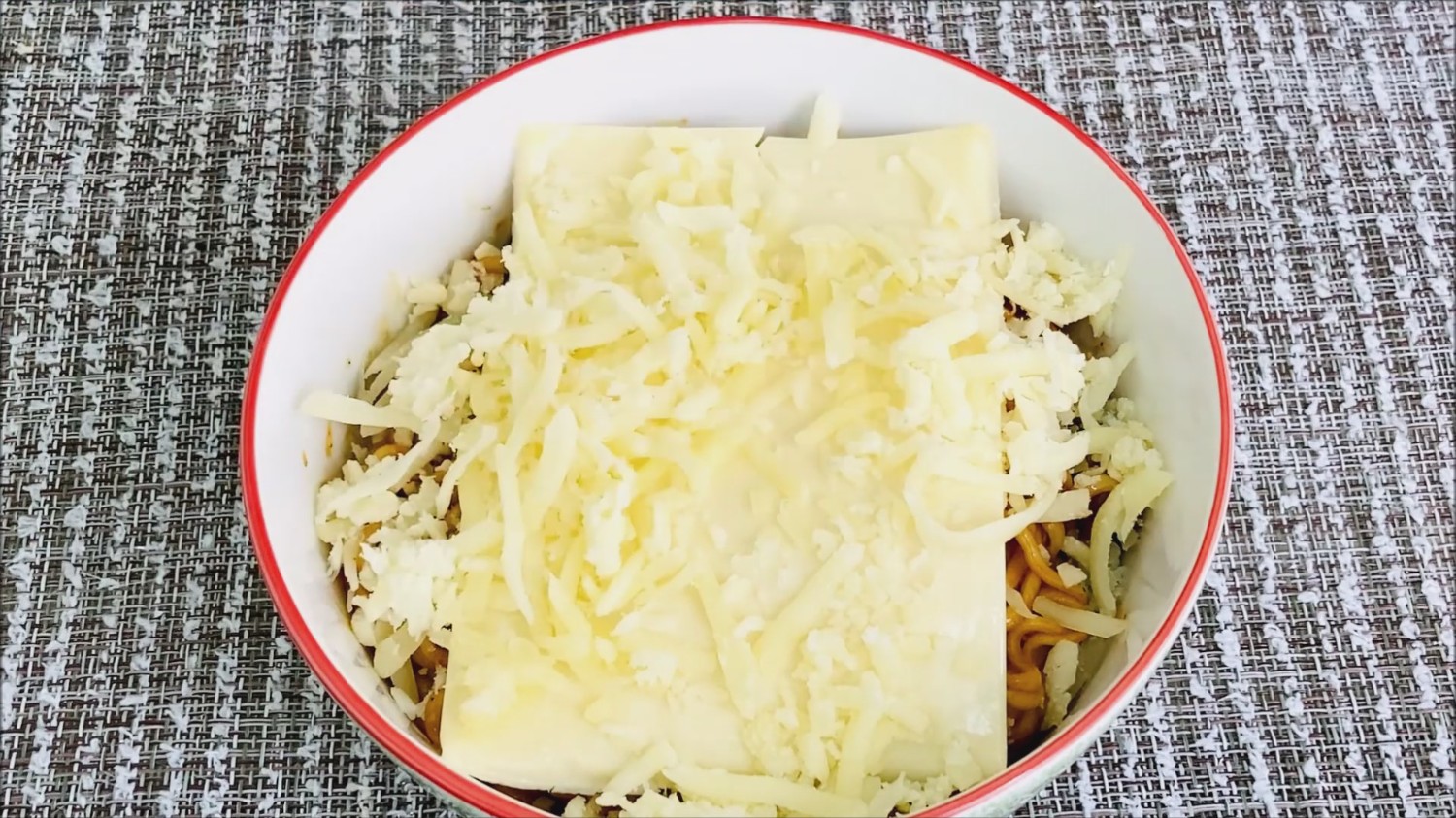 3.เอาไข่ออกจกไมโครเวฟ เทมาม่าบนไข่ โรยหน้าด้วยชีส เข้าไมโครเวฟ 1 นาที