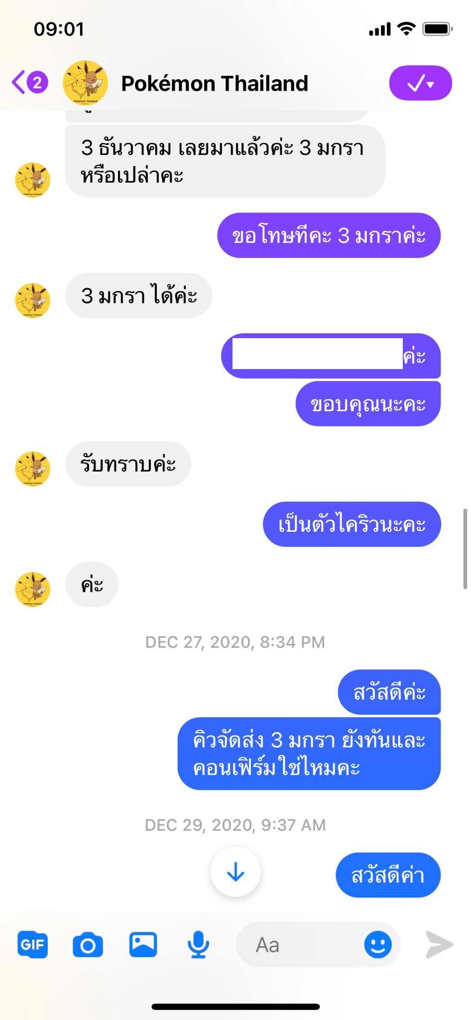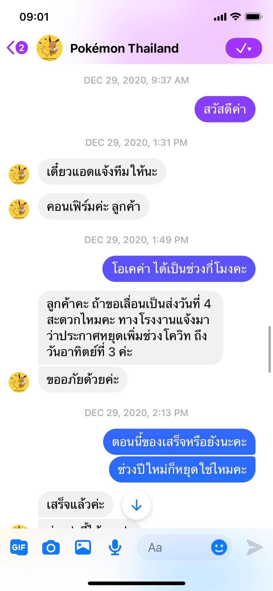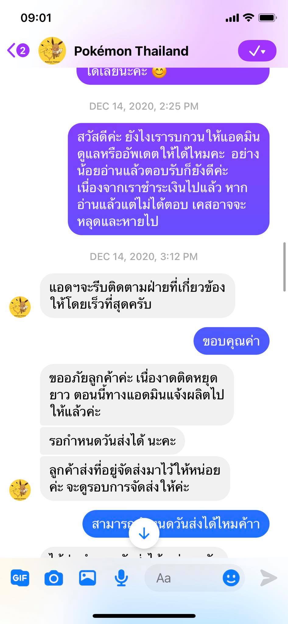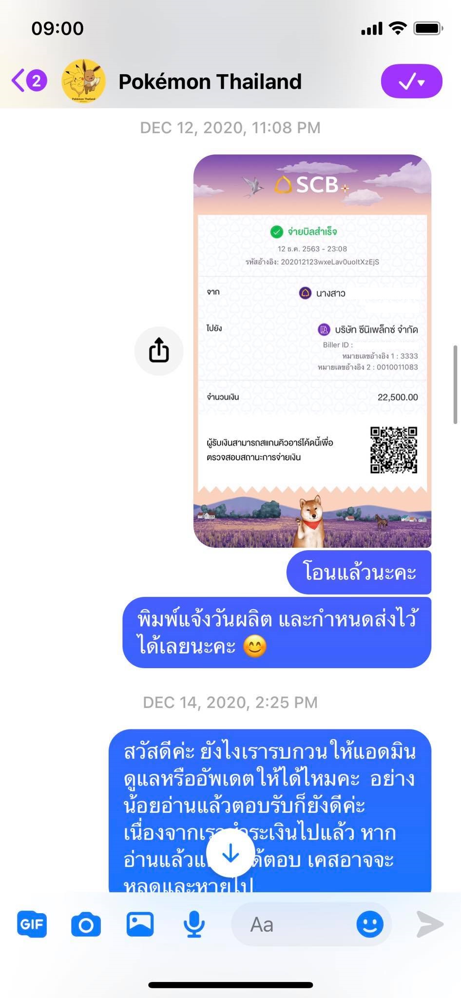 เริ่มเลยนะคะ คือ เมื่อช่วงเดือนธันวาคม 2563 ที่ผ่านมา เราทำการติดต่อเพจ Pokemon Thailand ไปค่ะ เพื่อตั้งใจจะสั่งผลิตตัวตุ๊กตาไคริว ไว้เซอร์ไพร์สแฟน (แฟนเราเกิดวันที่ 5 มกรา) เมื่อพูดคุยสรุปราคาเสร็จ เราจึงชำระเงินไปในวันที่ 12 ธันวาคม 2563 เวลา 23:08 น. เพื่อให้เริ่มผลิตเลย ราคาของตัวตุ๊กตาที่สั่งผลิตอยู่ที่ 22,500 บาท (รีบสั่ง รีบจ่ายเลยค่ะ กลัวผลิตไม่ทันวันที่ต้องการใช้)