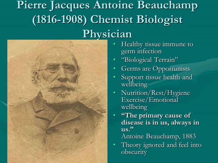 อังตวน บิวแชมพ์ ไม่เชื่อในทฤษฎีเชื้อโรค เขาบอกว่า สิ่งที่เรียกว่า เชื่อโรคนั้นมีอยู่ทั่วไป ทุกหนทุกแห่งในโลก