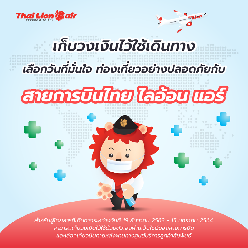 - บัตรโดยสารเส้นทางภายในประเทศทุกเส้นทาง ที่มีกำหนดการเดินทางระหว่าง 30 ธันวาคม 2563 - 31 มกราคม 2564 สามารถเปลี่ยนแปลงการเดินทางได้ โดยไม่เสียค่าธรรมเนียม