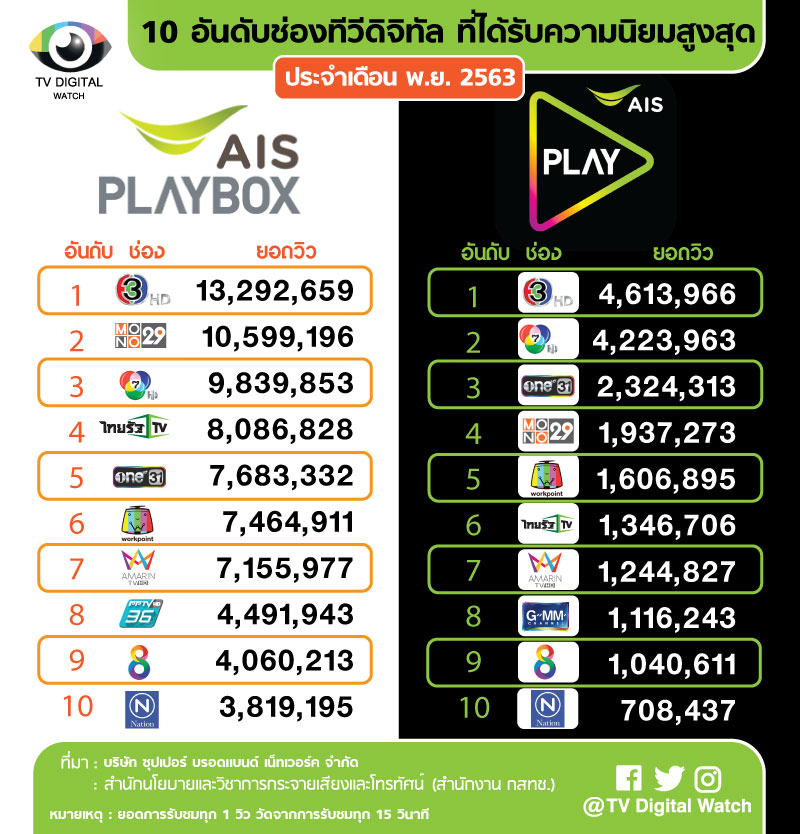 ช่อง 3 ขึ้นอันดับ 1 ยอดวิว AIS Play และ Play Box เดือนพ.ย.63